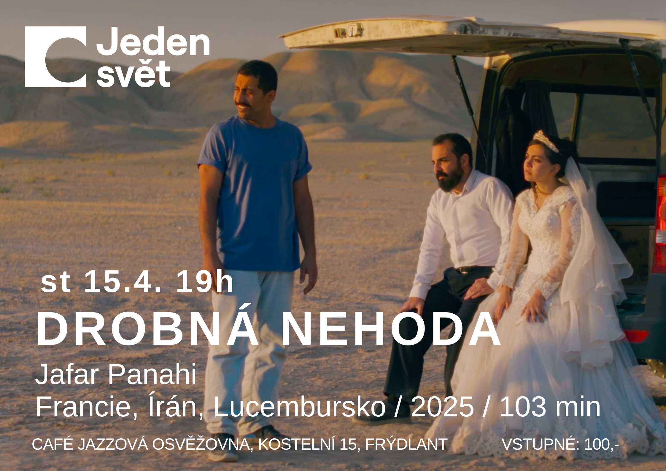 2026st15duben19.0021.00Jeden svět v Café J. O.: Drobná nehoda / Jafar Panahi / Francie, Írán, Lucembursko / 2025Café Jazzová Osvěžovna Frýdlant, Kostelní 15, Frýdlant19.00 - 21.00(GMT+02:00) Druh akceCAFÉ Jazzová osvěžovna,Festival,Promítání