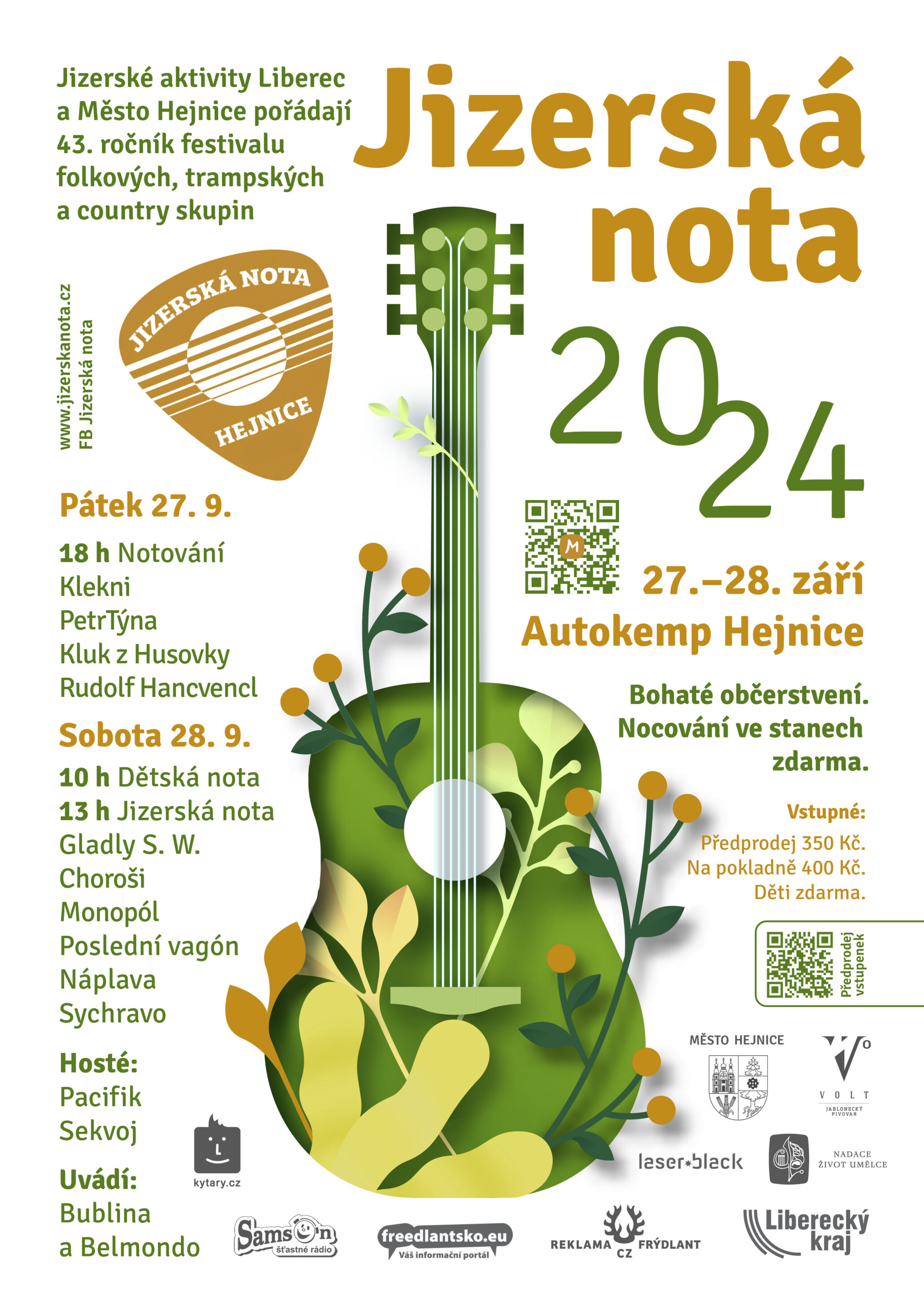 Jizerské aktivity Liberec a Město Hejnice pořádají 43. ročník festivalu folkových, trampských a country skupin Jizerská nota 2024 27.–28. září 2024 v Autokempu Hejnice Bohaté občerstvení. Nocování ve stanech zdarma. Pátek 27. 9.
