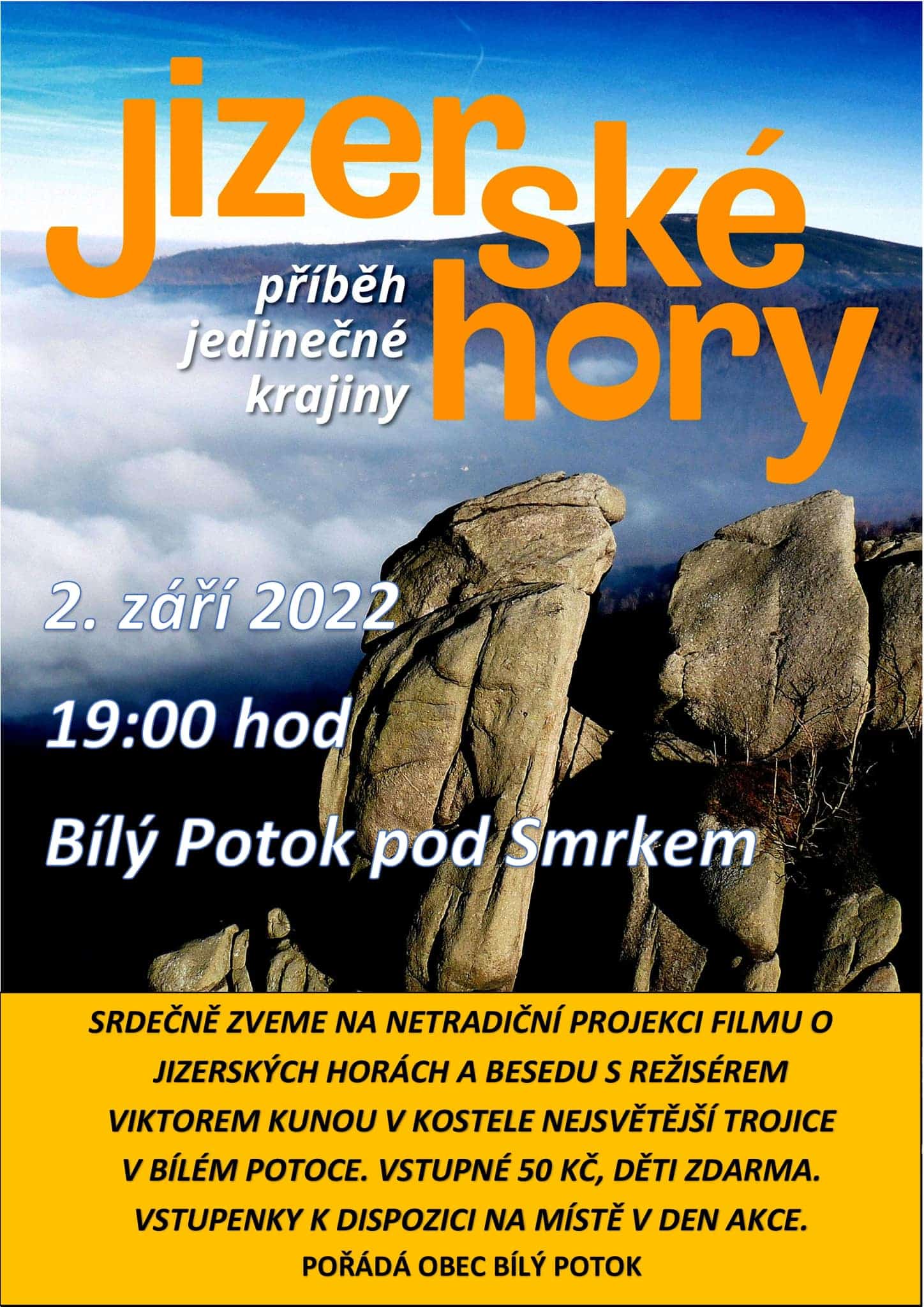 Obec Bílý Potok vás v pátek 2. září 2022 v 19.00 hodin srdečně zve na netradiční projekci filmu Jizerské hory do prostor Kostela Nejsvětější Trojice v Bílém Potoce.