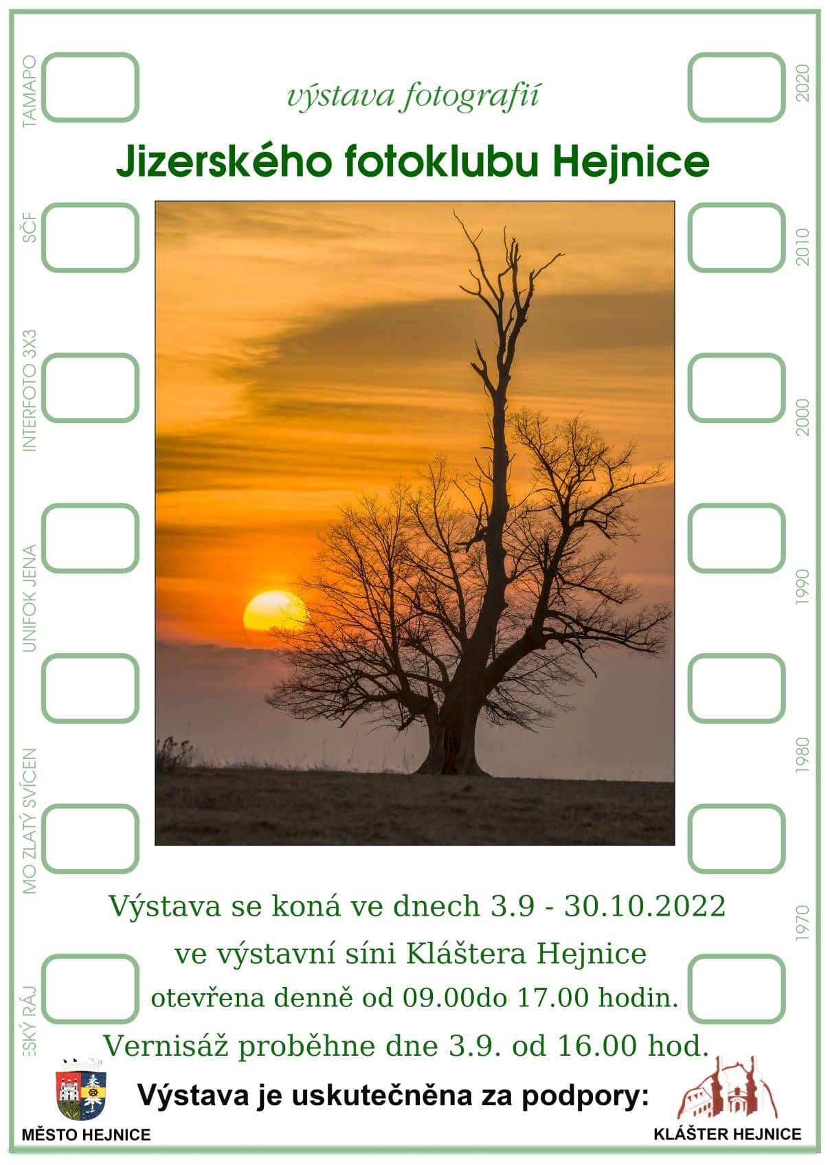 Tradiční výstava fotografií Jizerského fotoklubu Hejnice se koná ve dnech 3. září až 30. října 2022 ve výstavní síni Kláštera Hejnice.