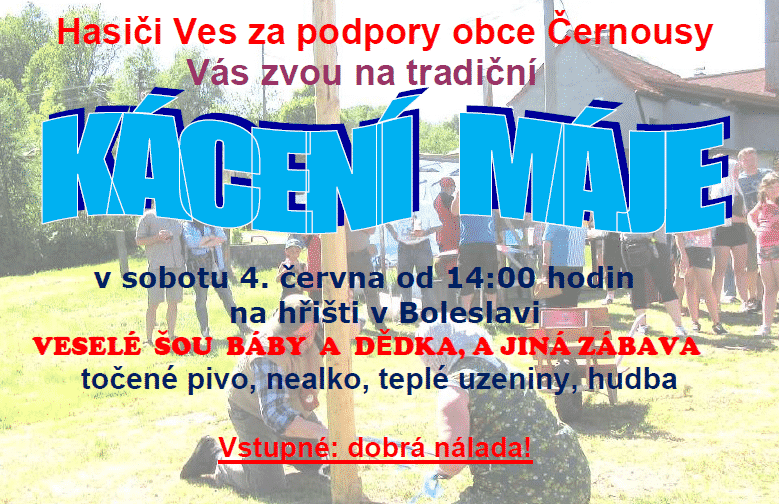 Hasiči Ves za podpory obce Černousy vás zvou na tradiční Kácení máje konané v sobotu 4. června 2022 od 14.00 hodin na hřišti v Boleslavi.