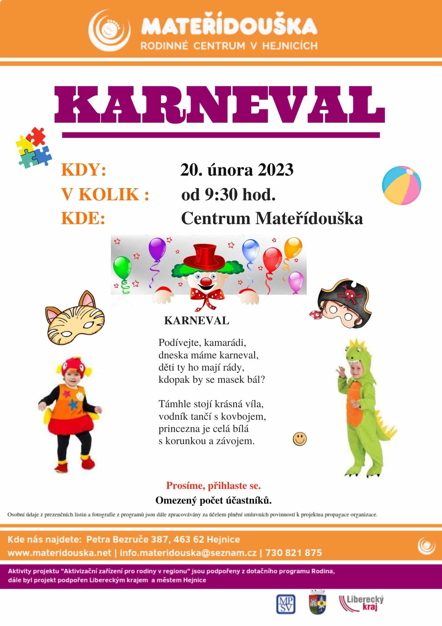 2023po20únor9.3012.00Karneval v rodinném centru Mateřídouška v HejnicíchCentrum Mateřídouška, Petra Bezruče 387 463 62 Hejnice9.30 - 12.00(GMT+01:00) Druh akceHejnice,Party,Pro děti,Rodinná akce,Společenská akce