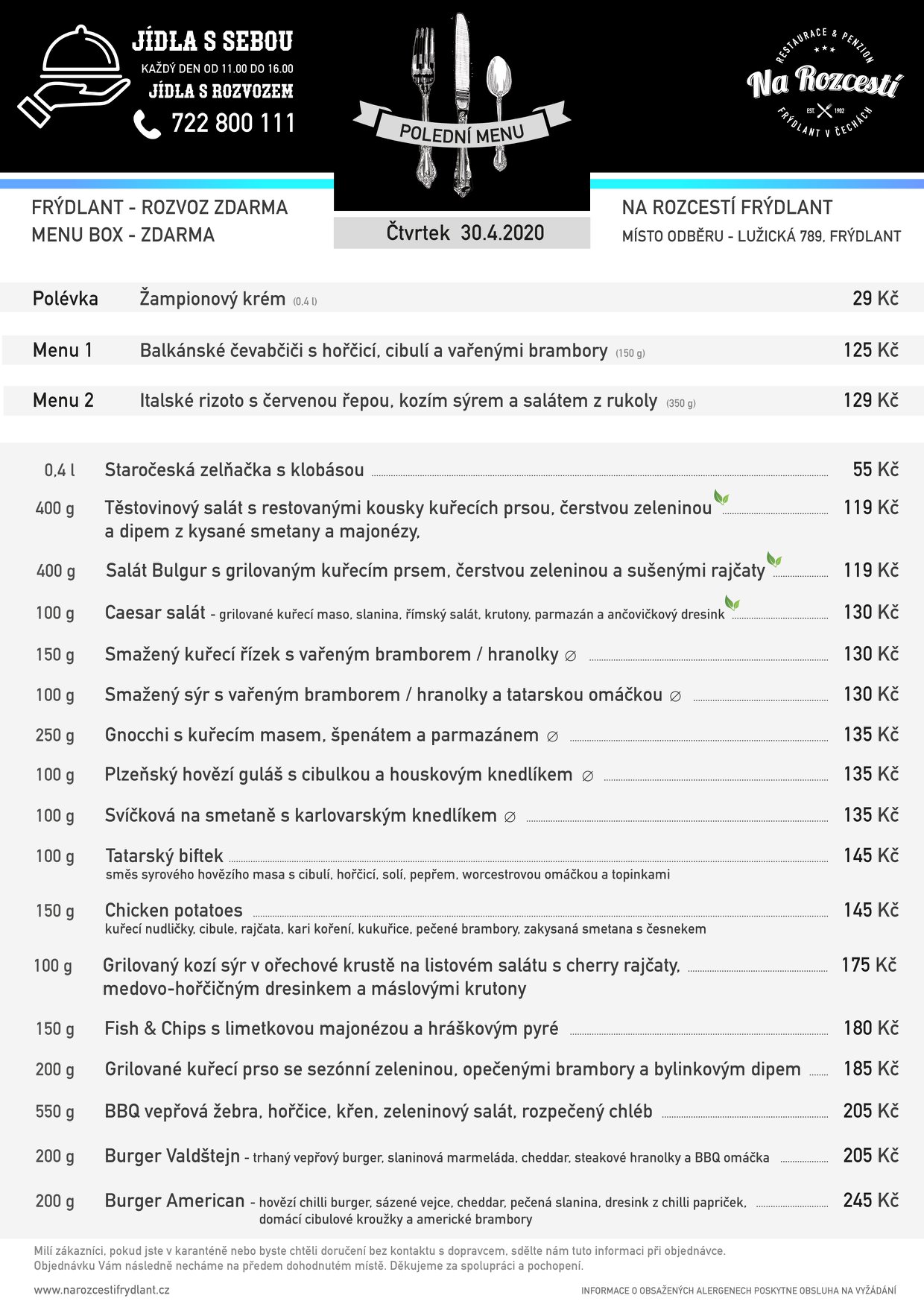 👨🍳 Kompletní menu – čtvrtek 30.4.2020 Děkujeme za Vaši přízeň a podporu. ❤️ Na Rozcestí Frýdlant 👌Sledujte náš kalendář akcí