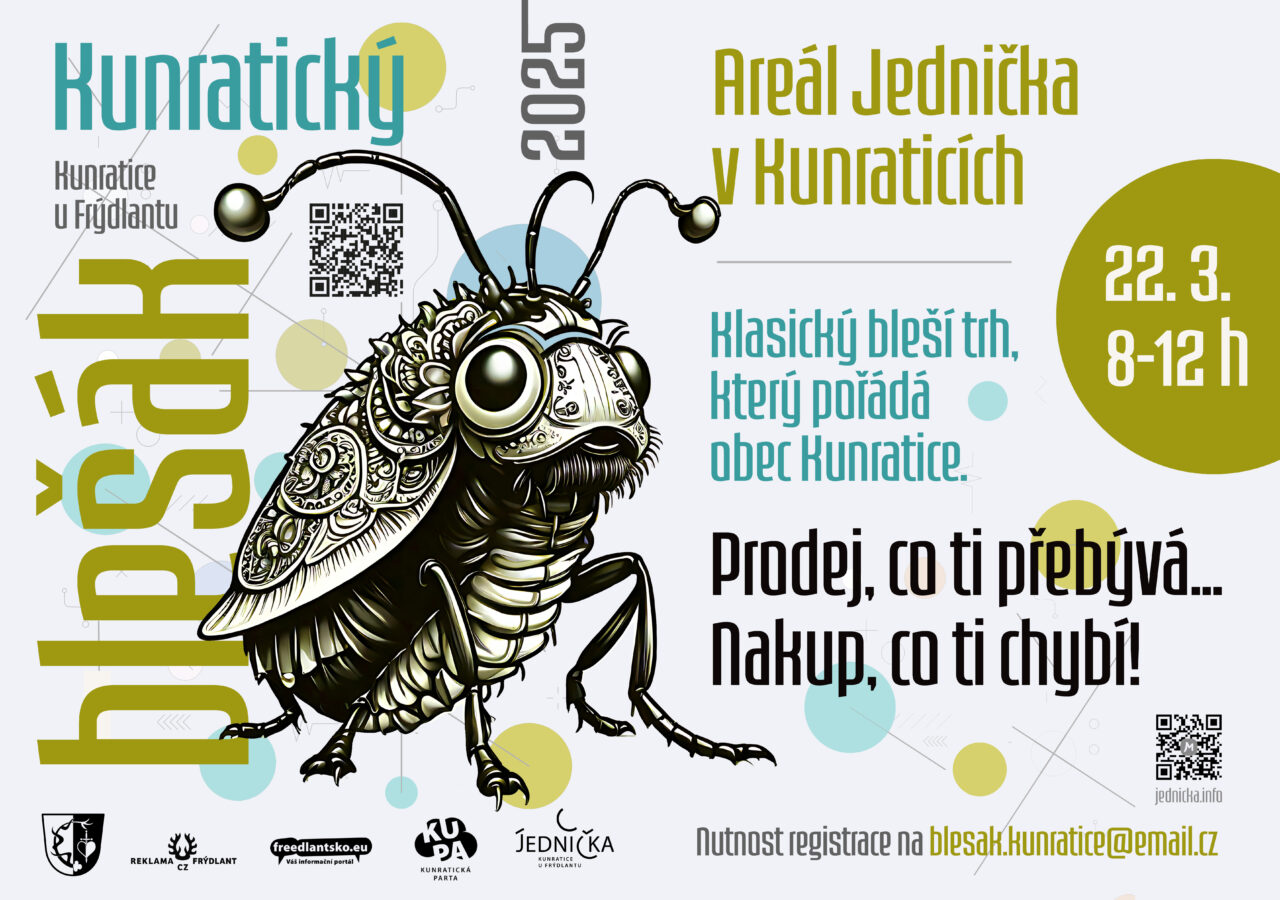 Klasický bleší trh, který pořádá obec Kunratice. Prodej, co ti prebývá… Nakup, co ti chybí! Nutnost registrace na blesak.kunratice@email.cz
