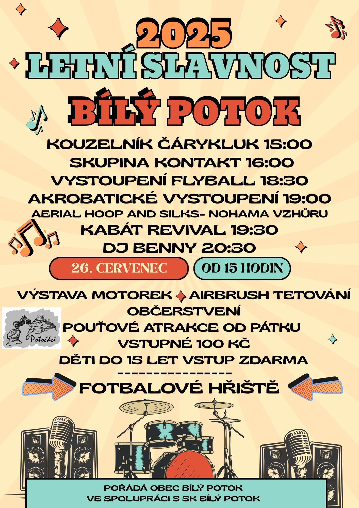 Obec Bílý Potok ve spolupráci s SK Bílý Potok vás srdečně zve na tradiční letní slavnost. Těšit se můžete na bohatý program pro celou rodinu: