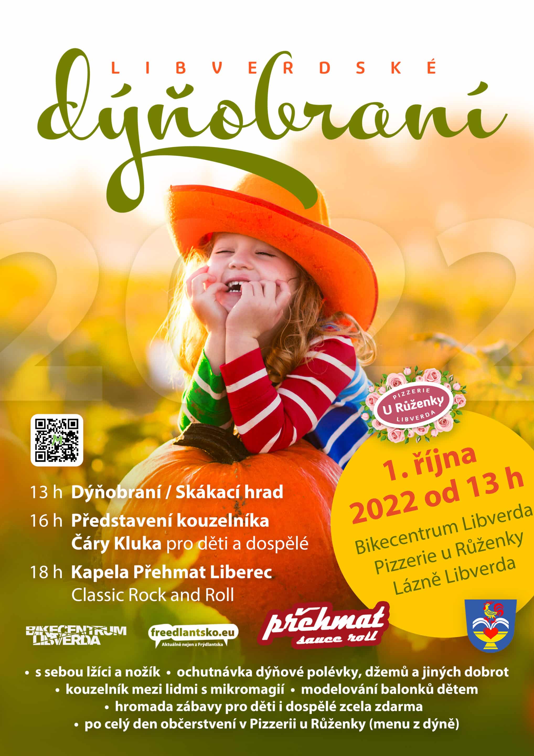 Bikecentrum Libverda, Pizzerie u Růženky a obec Lázně Libverda vás v sobotu 1. října 2022 od 13.00 hodin zvou na Libverdské dýňobraní. 13.00 hodin Dýňobraní / skákací hrad 16.00 hodin Představení kouzelníka