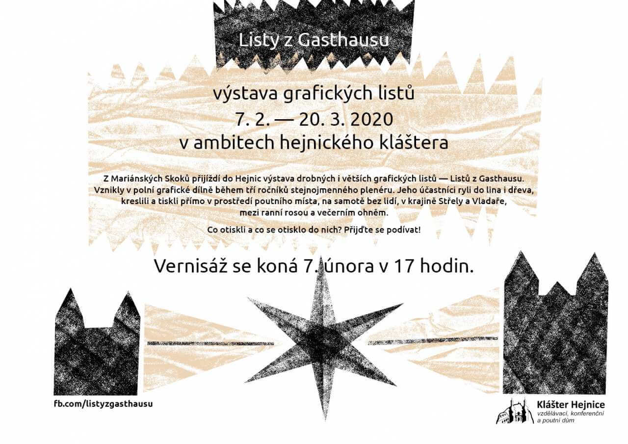 Z Mariánských Skoků přijíždí do Hejnic výstava drobných i větších grafických listů ー Listů z Gasthausu. Vznikly v polní grafické dílně během tří ročníků stejnojmenného plenéru. Jeho účastníci ryli do lina i dřeva, kreslili a tiskli přímo v prostředí poutního místa, na samotě bez lidí, v krajině Střely a Vladaře, mezi ranní rosou a večerním ohněm.