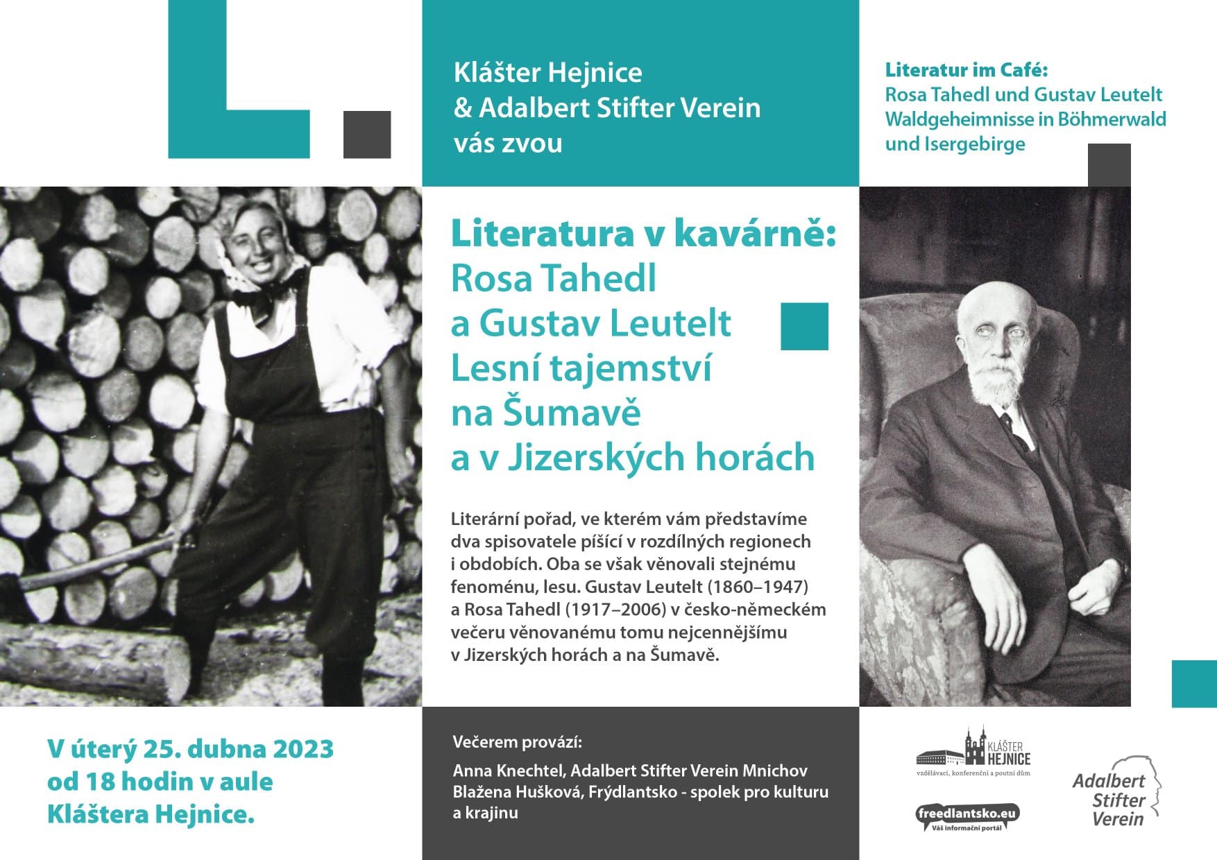 Zveme vás v úterý 25. dubna 2023 od 18.00 hodin do auly Kláštera Hejnice na Literatura v kavárně: Rosa Tahedl a Gustav Leutelt – lesní tajemství na Šumavě a v