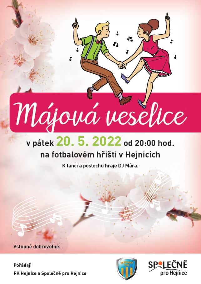 Spolek Společně pro Hejnice a FK Hejnice srdečně zvou na MÁJOVOU VESELICI, která se koná v pátek 20. května 2022 od 20:00 hodin na fotbalovém hřišti FK Hejnice.