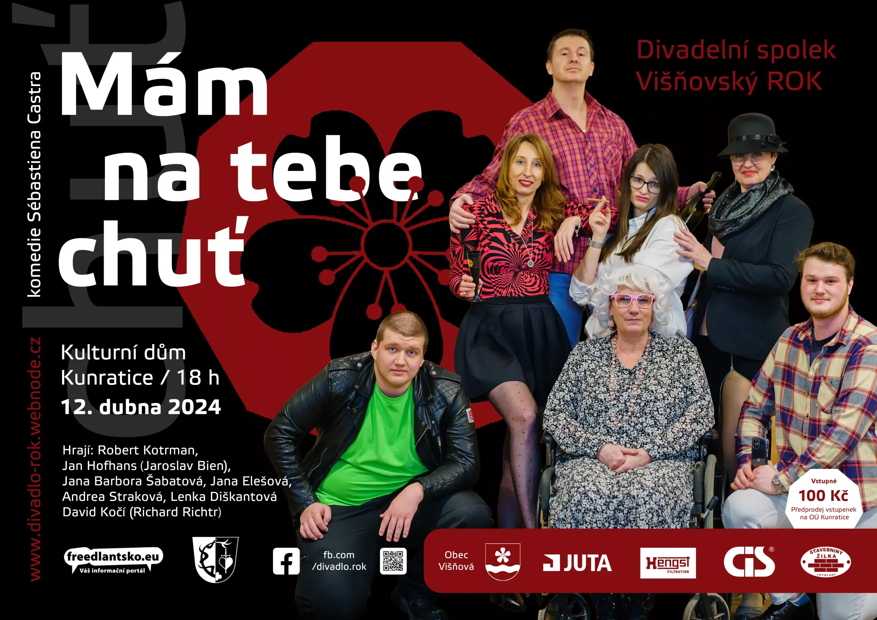 Mám na Tebe chuť Komedie Sébastiena Castra 12. dubna 2024 od 18 hodin v Kulturním domě v Kunraticích. Hrají: Robert Kotrman, Jan Hofhans (Jaroslav Bien), Jana Barbora Šabatová, Jana Elešová, Andrea Straková, Lenka
