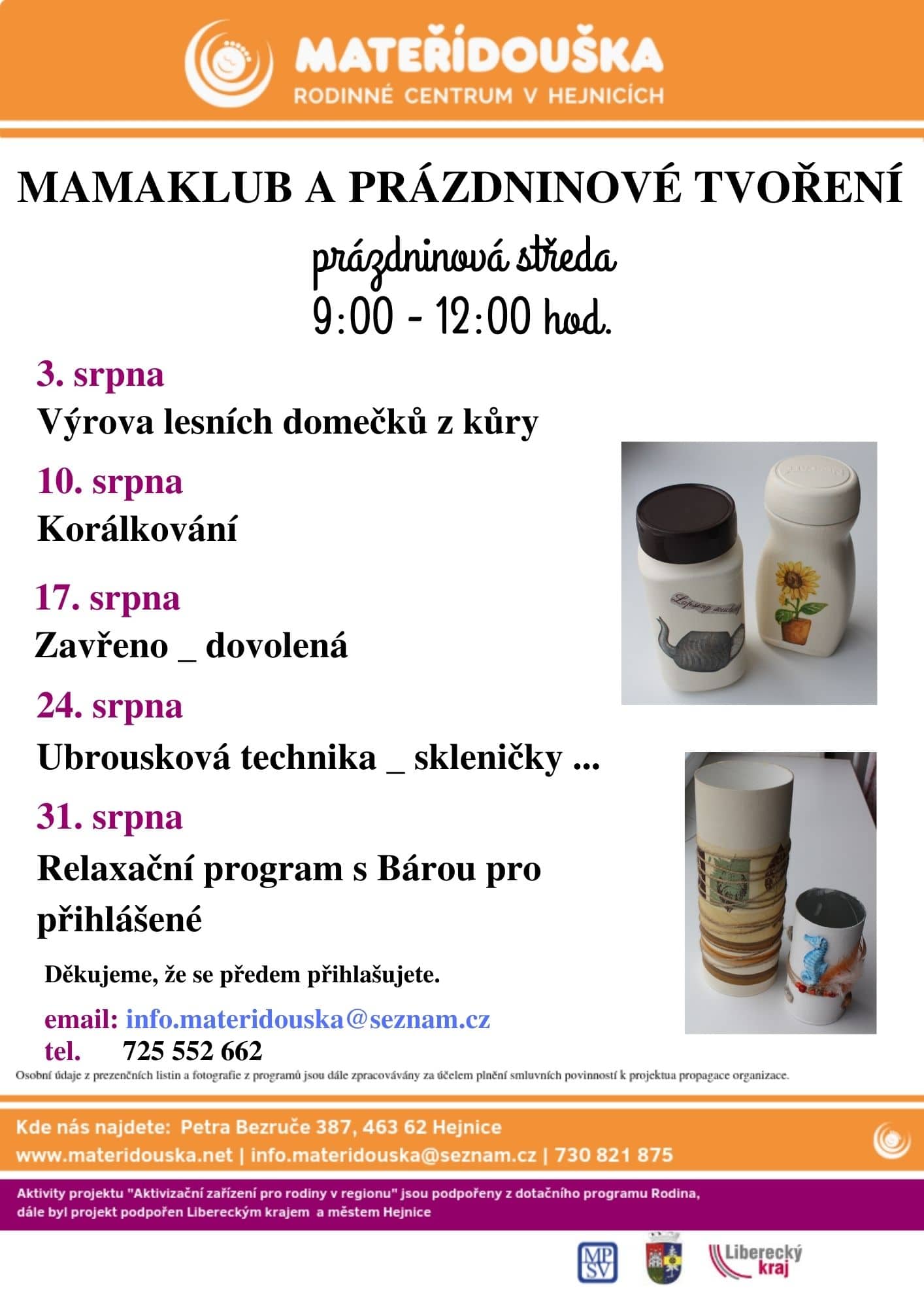 Program Mamaklubu a prázdninové tvoření s rodinným centrem Mateřídouška v Hejnicích v měsíci srpnu 2022.