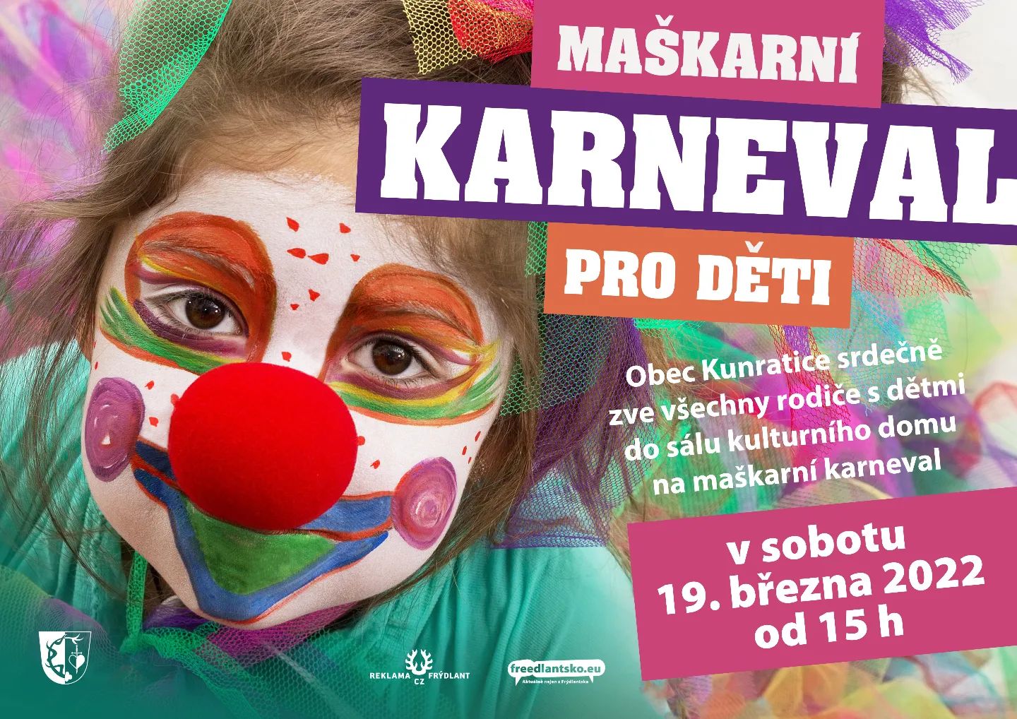 Obec Kunratice srdečně zve v sobotu 19. března 2022 od 15.00 hodin všechny rodiče s dětmi do Kulturního domu na maškarní karneval pro děti.
