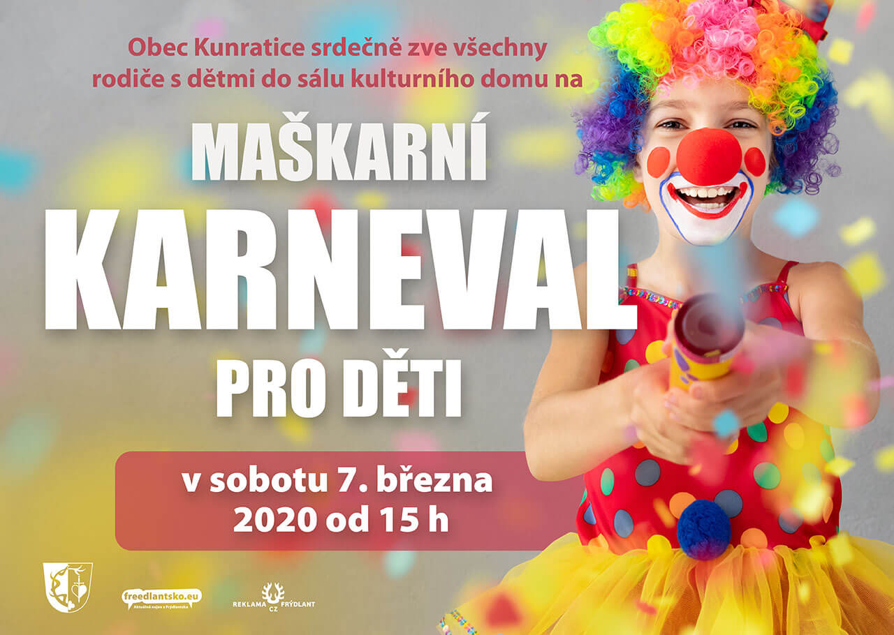 Obec Kunratice srdečně zve všechny rodiče s dětmi do sálu kulturního domu v sobotu 7. března 2020 od 15 h na Maškarní karneval pro děti.