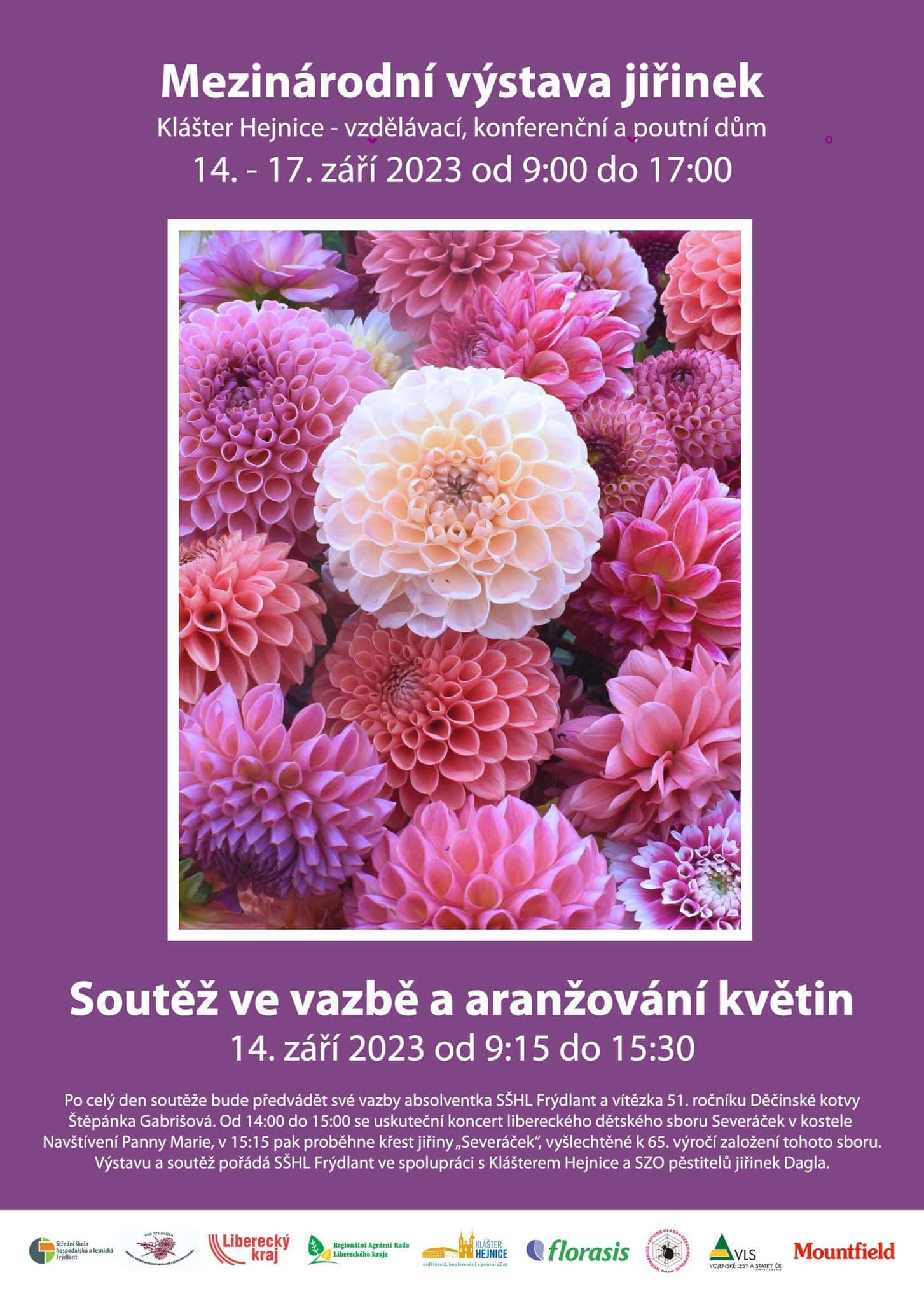 2023čt14září(září 14)9.00ne17(září 17)17.00Mezinárodní výstava jiřinek 2023Klášter Hejnice - Mezinárodní centrum duchovní obnovy, Klášterní 1 463 62 Hejnice Liberecký kraj9.00 - 17.00 (17)(GMT+02:00) Druh akceSoutěže,Střední školy a gymnázia,Veřejná akce,Výstava