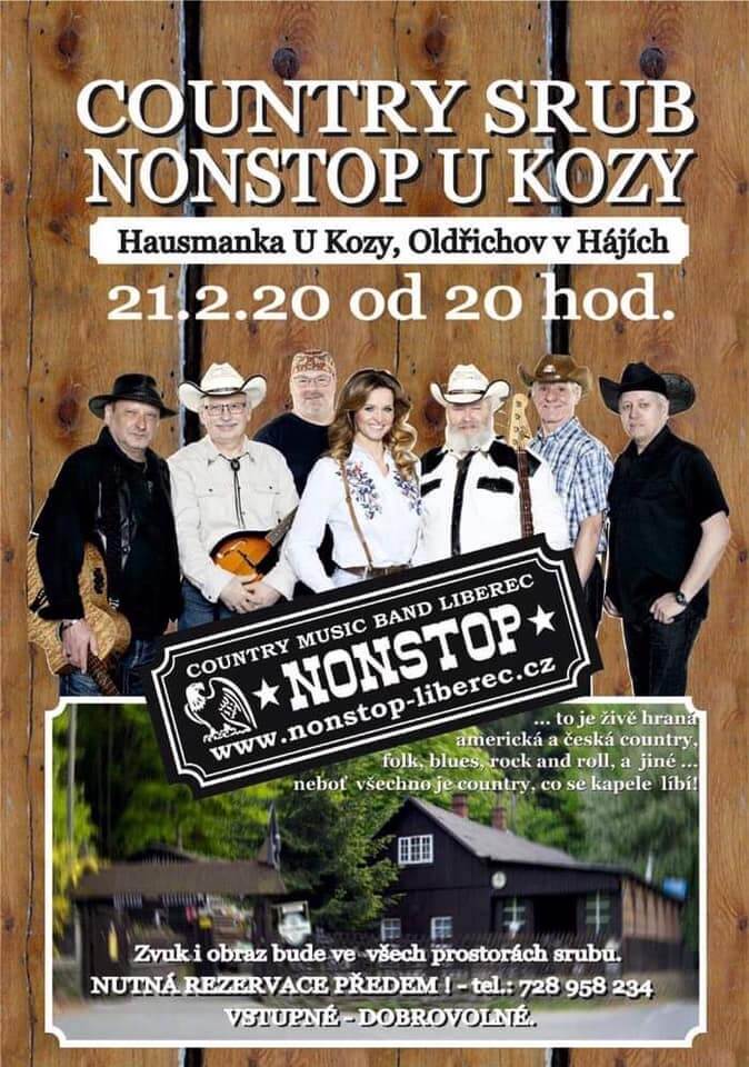 202021únor20.0023.59NONSTOP U KozyU Kozy20.00 - 23.59(GMT+01:00) Druh akceCountry,Koncert,Společenská akce,Zábava
