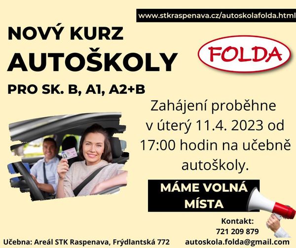 Nový kurz autoškoly v areálu STK Raspenava, Frýdlantská 772, 46401 Raspenava, pro skupinu B, A1, A2+B, bude zahájen 11. dubna 2023. od 17.00 hodin. Žádosti stále přijímáme! Více informací