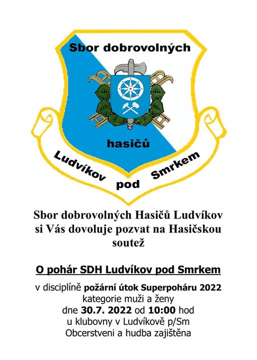 Sbor dobrovolných hasičů Ludvíkov si vás dovoluje pozvat na hasičskou soutěž O pohár SDH Ludvíkov pod Smrkem v disciplíně požární útok Superpoháru 2022.