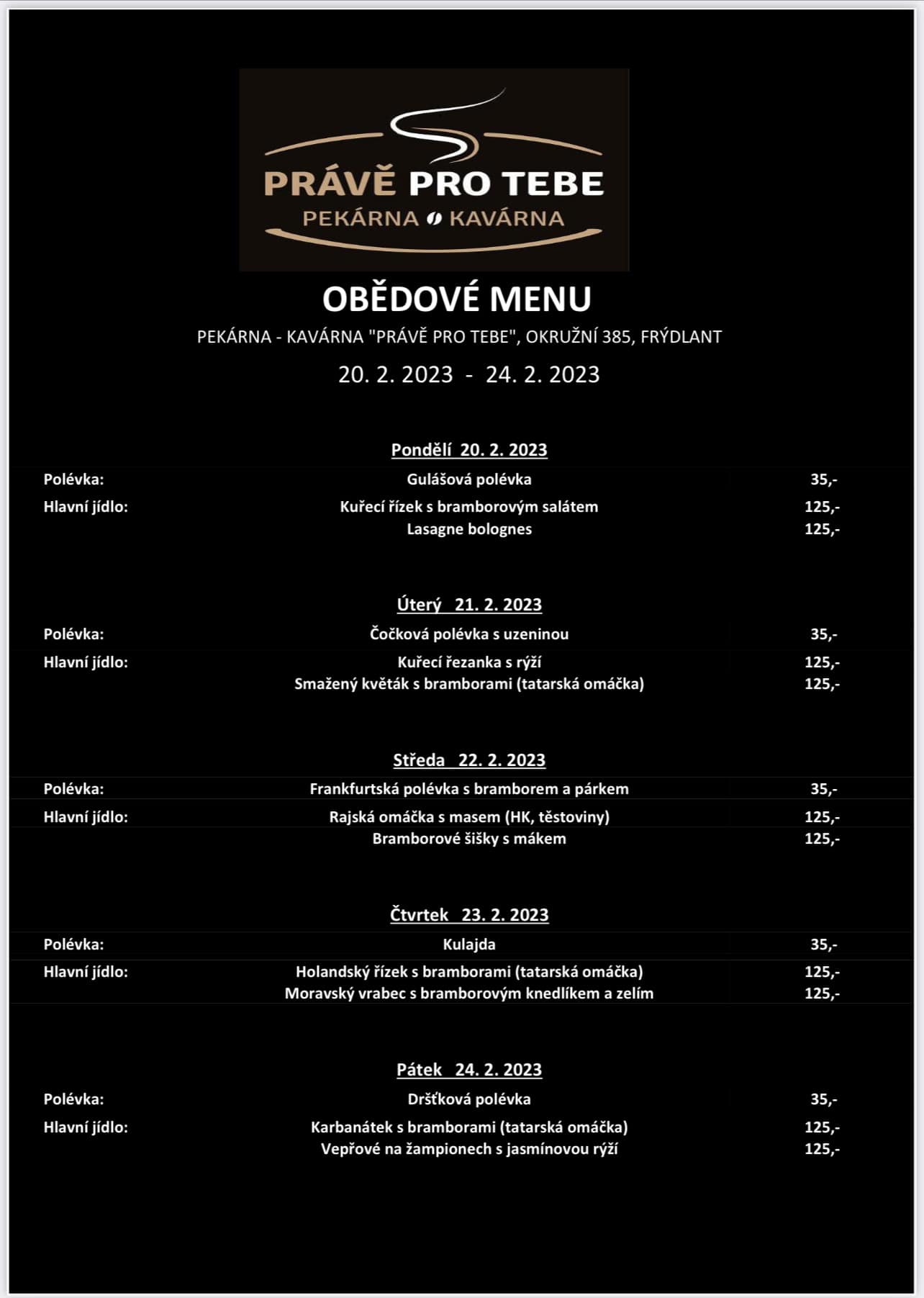 Nabídka poledního menu v Právě pro TebePekárna Frýdlant na týden 20. – 24. února 2023.