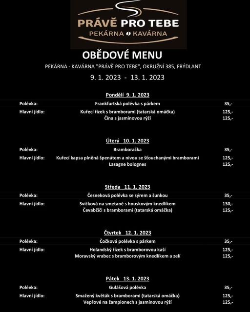 Nabídka poledního menu v Právě pro TebePekárna Frýdlant na týden 9. – 13. ledna 2023.