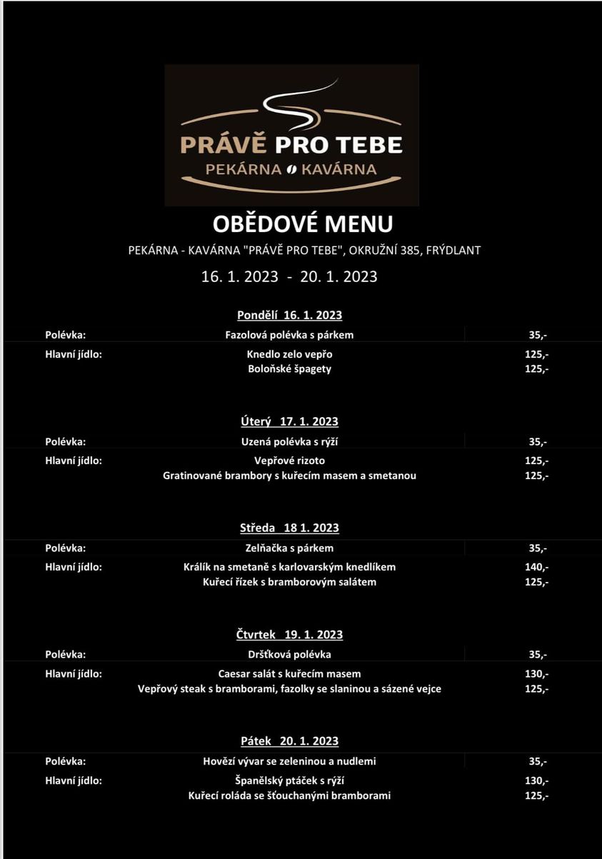 Nabídka poledního menu v Právě pro TebePekárna Frýdlant na týden 16. – 20. ledna 2023.