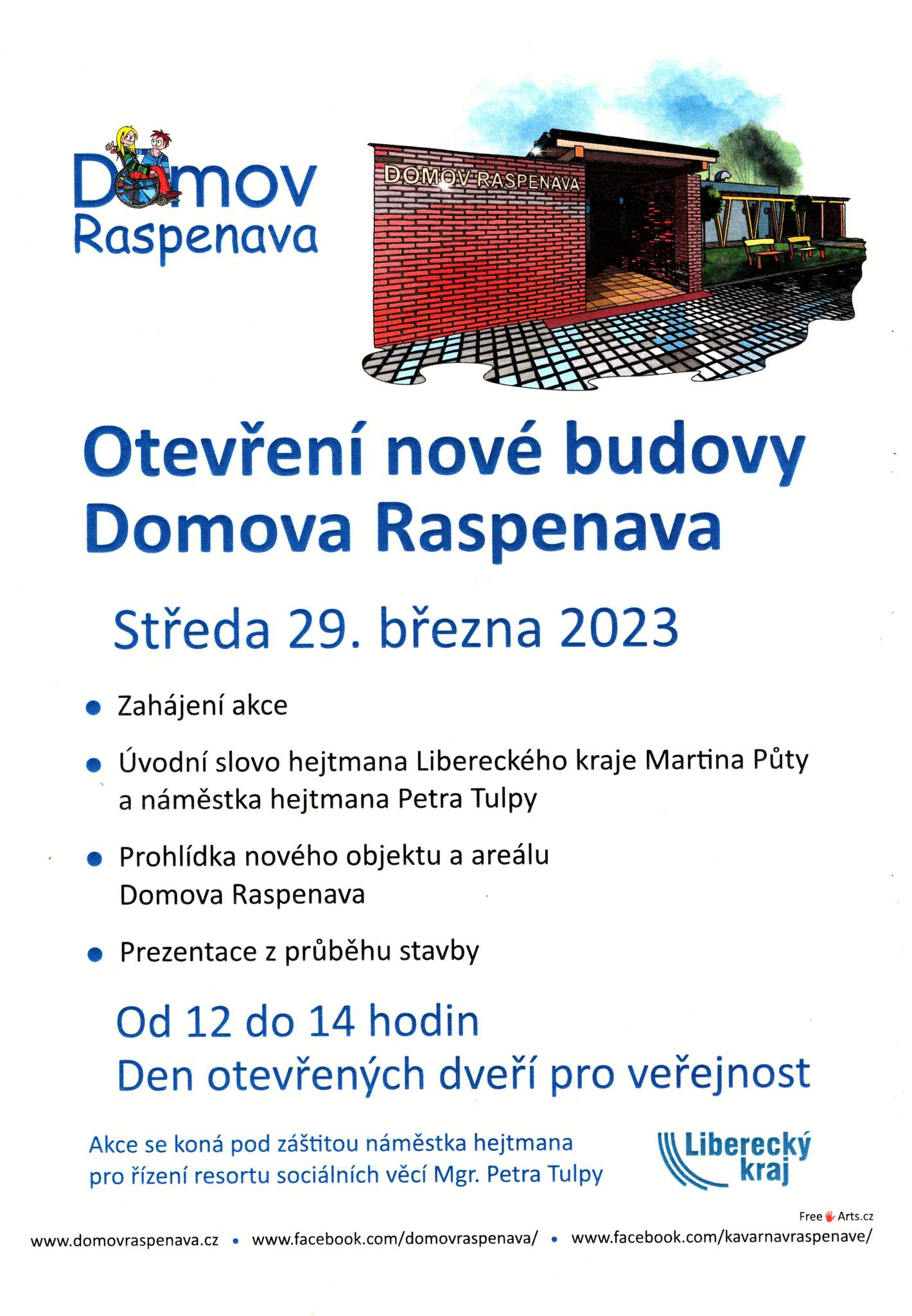 Domov Raspenava si vás dovoluje pozvat 29. března 2023 na otevření nové budovy a Den otevřených dveří. Od 12.00 do 14.00 hodin. Úvodní slovo hejtmana Libereckého kraje Martina Půty a náměstka hejtmana