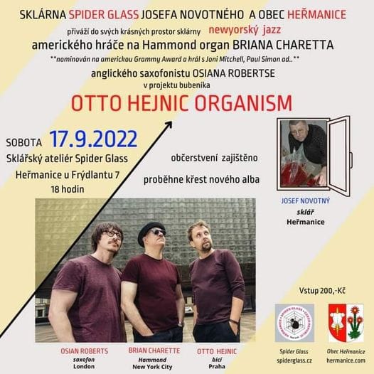 přiváží do svých krásných prostor sklárny newyorský jazz amerického hráče na Hammond organ Briana Charetta a anglického saxofonistu Osiana Robertse v projektu Otto Hejnic Organism. Proběhne i křest nového alba.