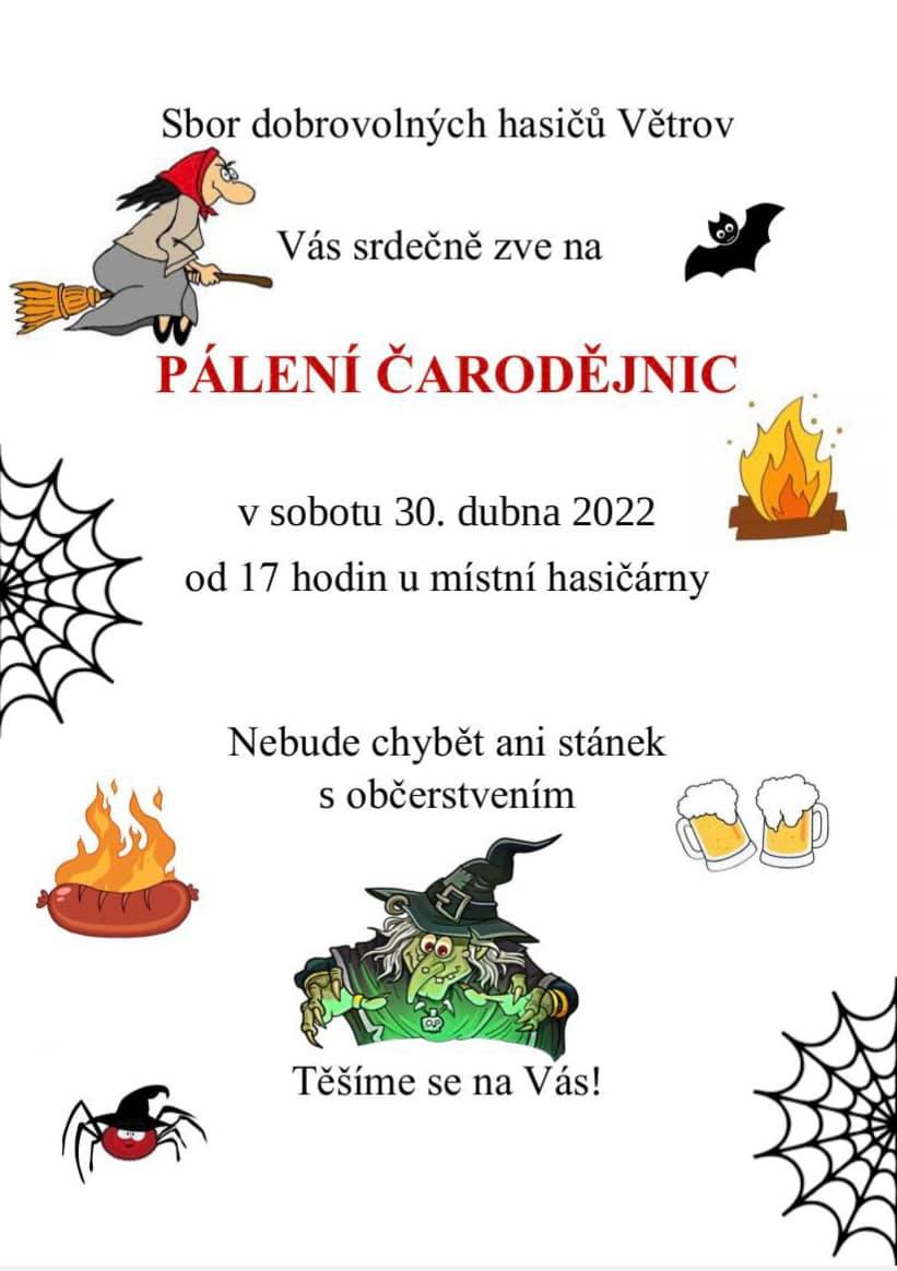Svaz dobrovolných hasičů Větrov pořádá Pálení čarodějnic v sobotu 30. dubna 2022 od 17.00 hodin u místní hasičské zbrojnice.
