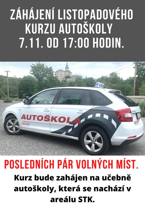 V listopadu budeme zahajovat poslední letošní kurz autoškoly pro skupinu B. První lekce 7. listopadu 2022, učebna autoškoly, Folda – STK, Autoškola, Školicí středisko. Zbývá posledních pár volných