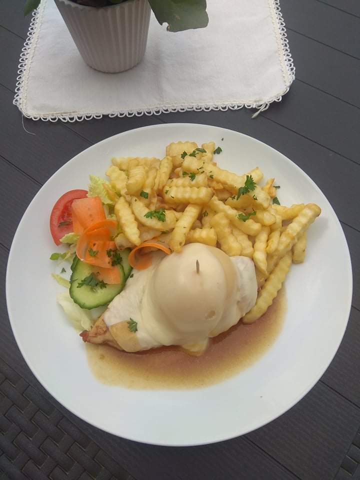 Kuřecí steak s broskví, hranolky, včetně polévky dle výběru … 130 Kč