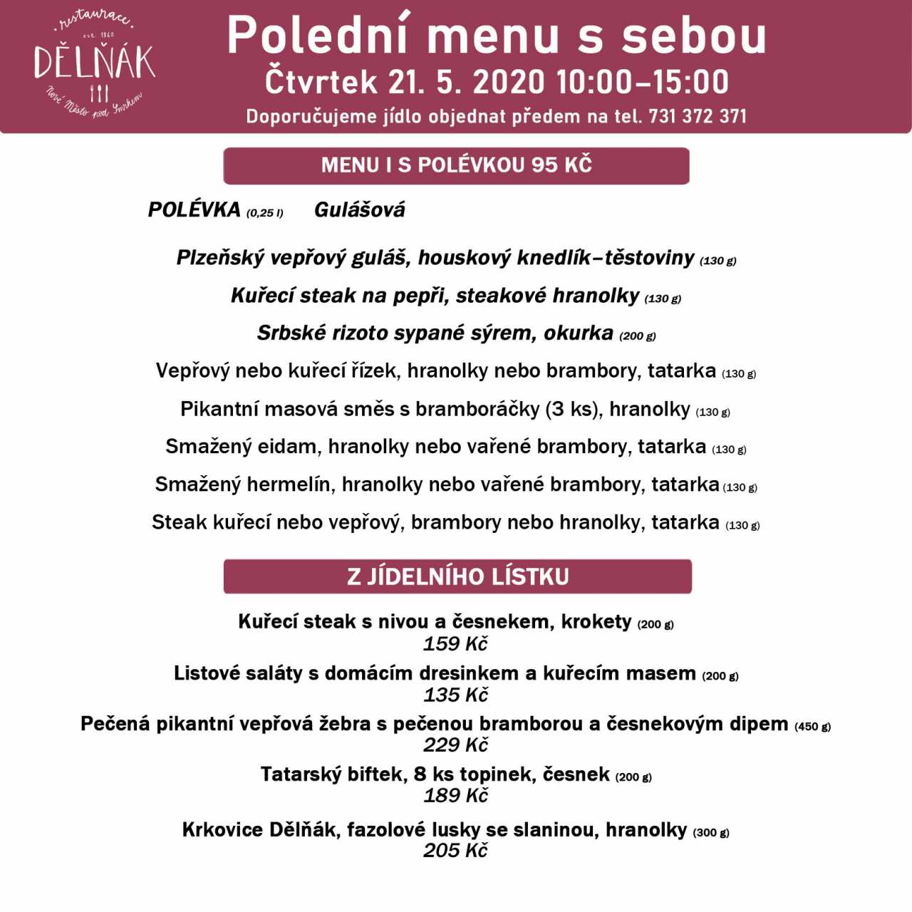 Polední menu na čtvrtek 21. 5., které pro Vás vaříme od 10:00 do 15:00. 🤩 Doporučujeme objednat jídlo předem na tel. 731