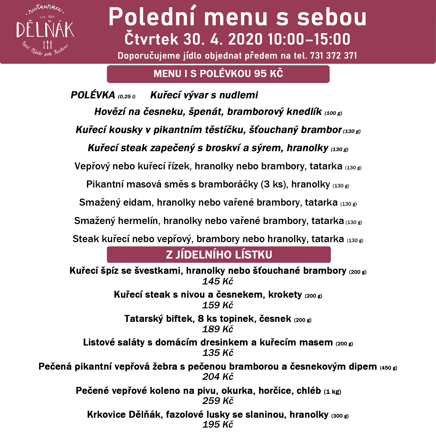 Polední menu na čtvrtek 30. 4. které pro Vás vaříme od 10:00 do 15:00. 🤩