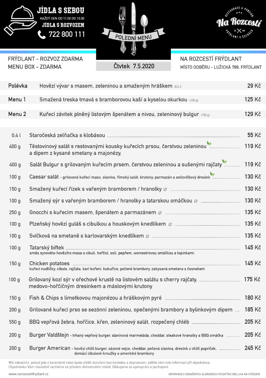 👨🍳 Kompletní menu – čtvrtek 7. 5. 2020 Objednávky na 📞 722 800 111 nebo osobně. Děkujeme za Vaši přízeň a podporu.