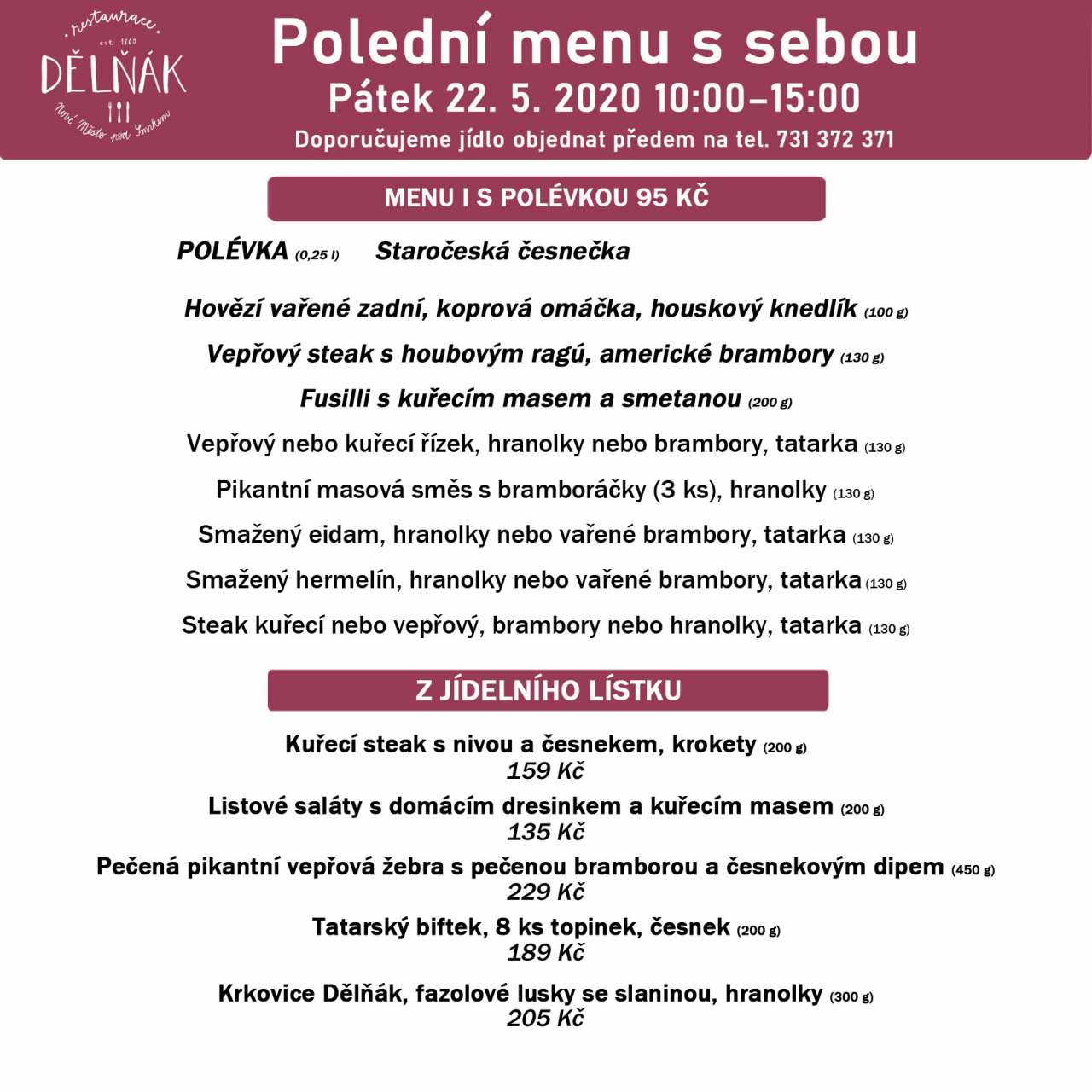 Polední menu na pátek 22. 5., které pro Vás vaříme od 10:00 do 15:00. 🤩