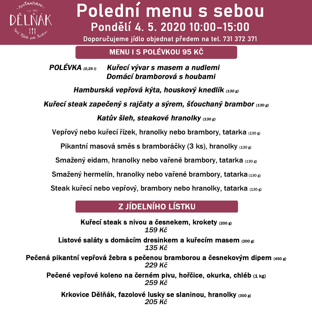 Polední menu na pondělí 4. 5. které pro Vás vaříme od 10:00 do 15:00. 🤩