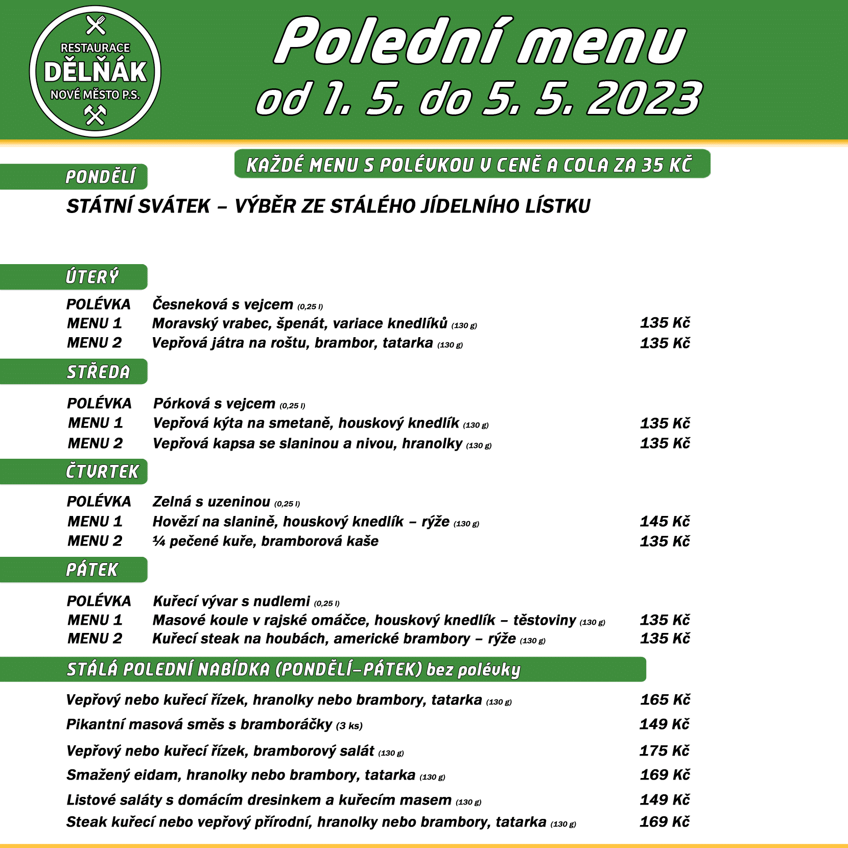 Polední menu na týden 1. až 5. května 2023 restaurace Dělňák v Novém Městě pod Smrkem