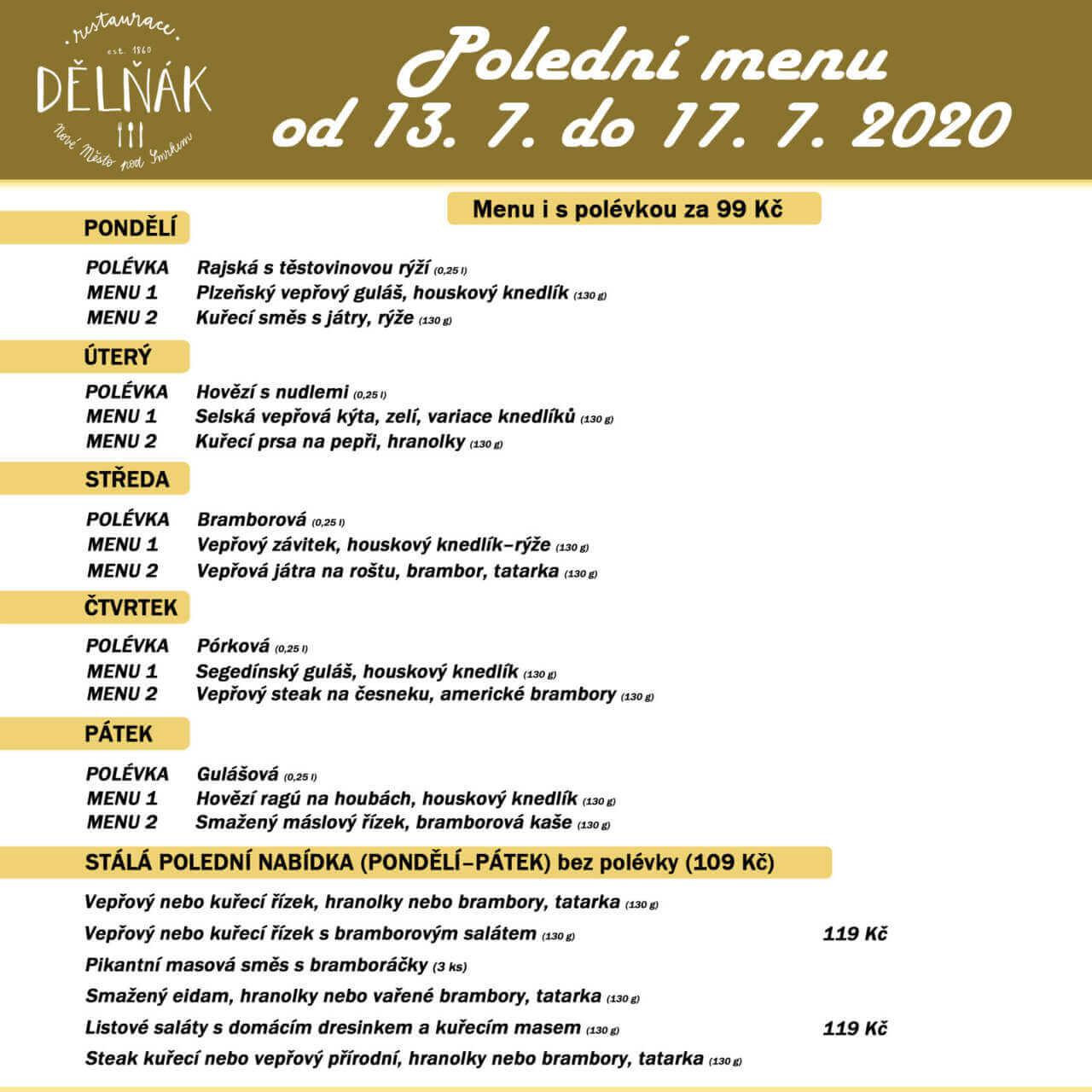 Tento týden pro Vás vaříme toto menu. Platí od pondělí 13. 7. do pátku 17. 7. 2020 každý den od od 11.00 h do 14.00 h, nebo do vyprodání Jídlo