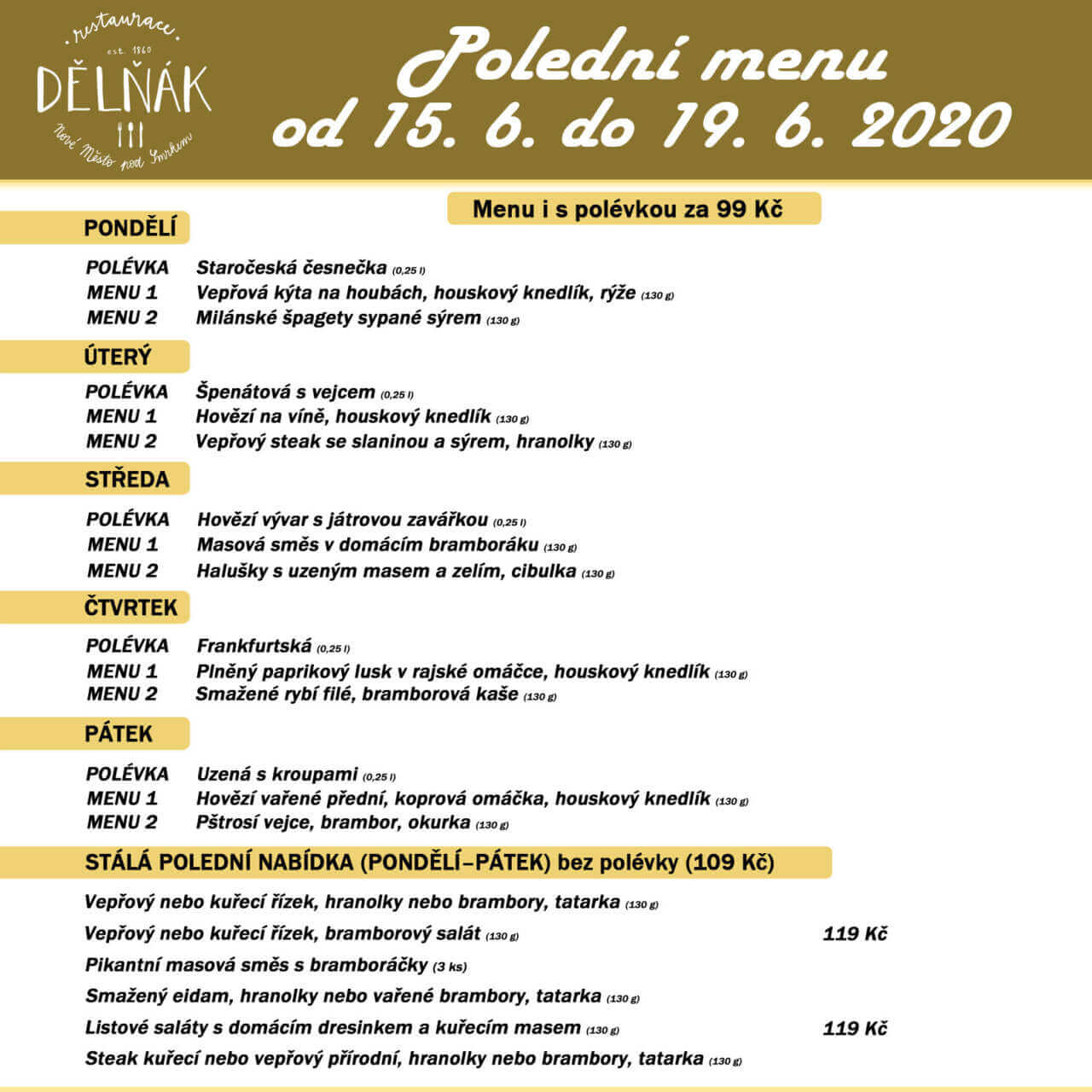 Tento týden pro Vás vaříme toto menu. Platí od pondělí 15. 6. do pátku 19. 6. 2020 každý den od od 11.00 h do 14.00 h, nebo do vyprodání PONDĚLÍ 0,25