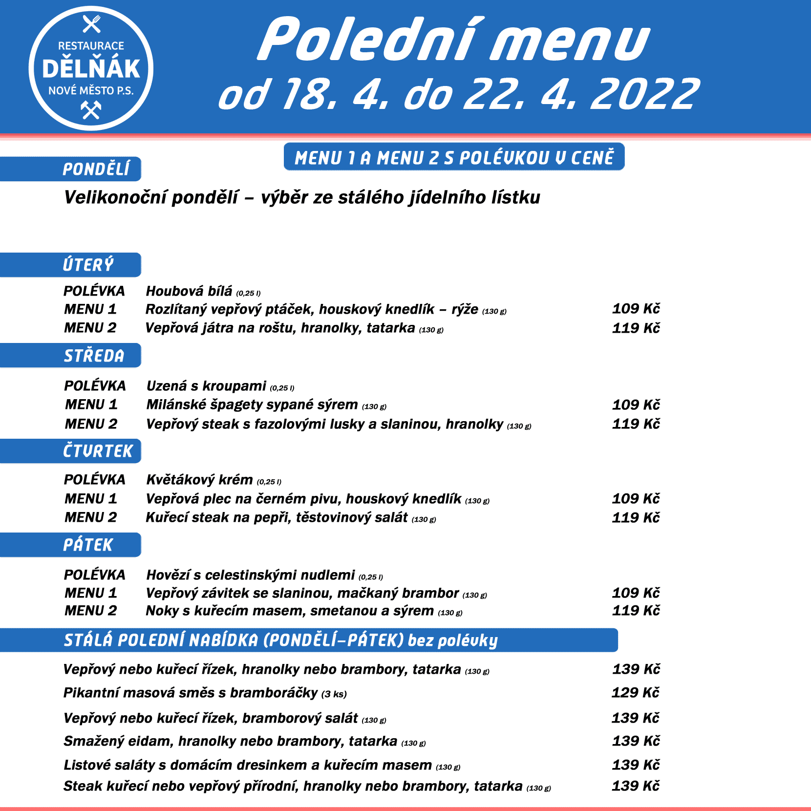 Polední menu na týden 18. – 22. dubna 2022 restaurace Dělňák v Novém Městě pod Smrkem