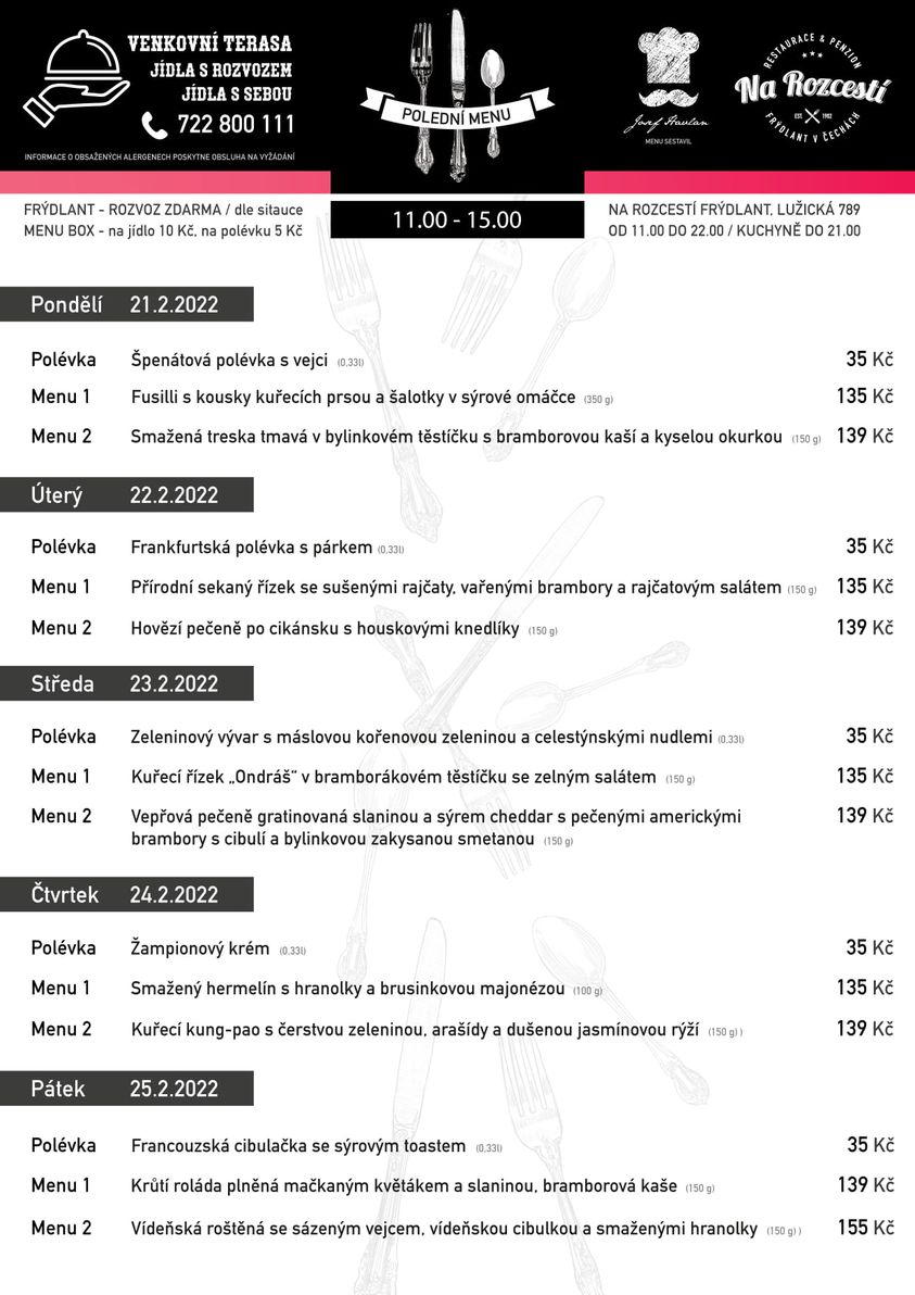 Jídla a nápoje z POLEDNÍHO MENU můžete konzumovat přímo v naší restauraci nebo si je můžete objednávat telefonicky na přesný čas a poté si je vyzvednout na naší provozovně.