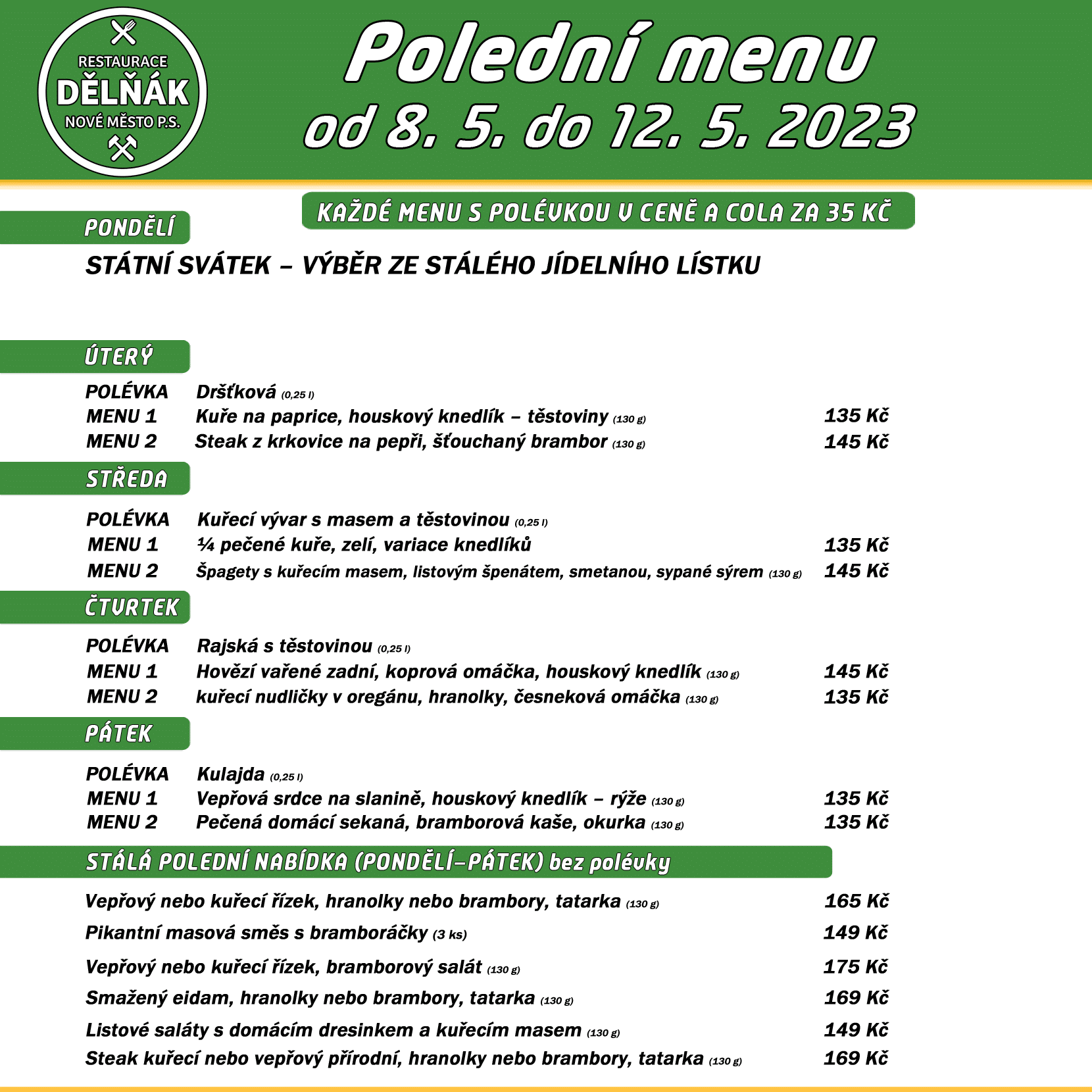 Polední menu na týden 8. až 12. května 2023 restaurace Dělňák v Novém Městě pod Smrkem