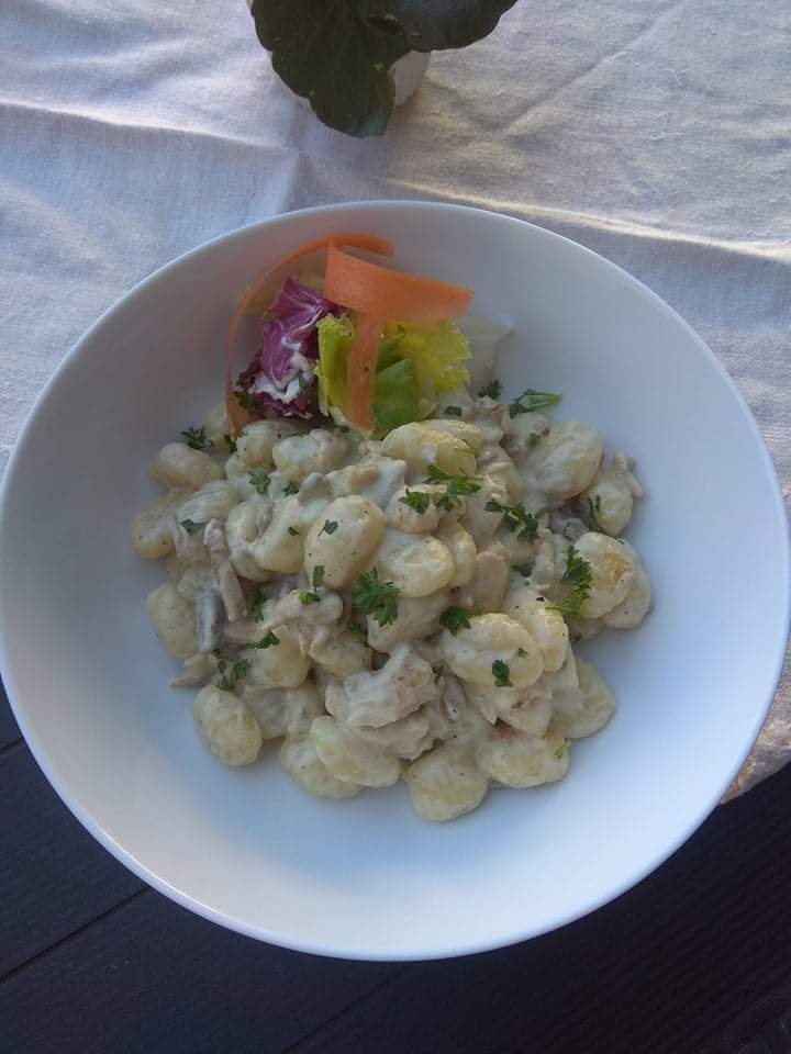 Gnocchi ve smetanové omáčce s kuřecím masem a žampióny …. 119 Kč včetně polévky