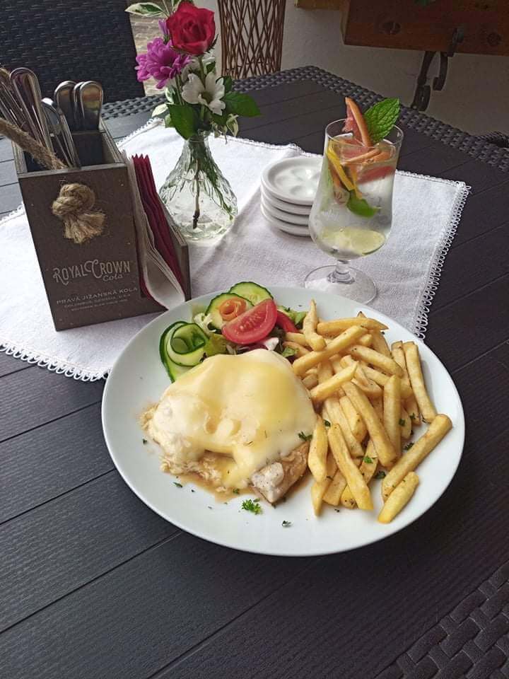 Kuřecí plátek se šunkou a sýrem, šťouchaný brambor nebo hranolky, včetně polévky dle výběru … 130 Kč