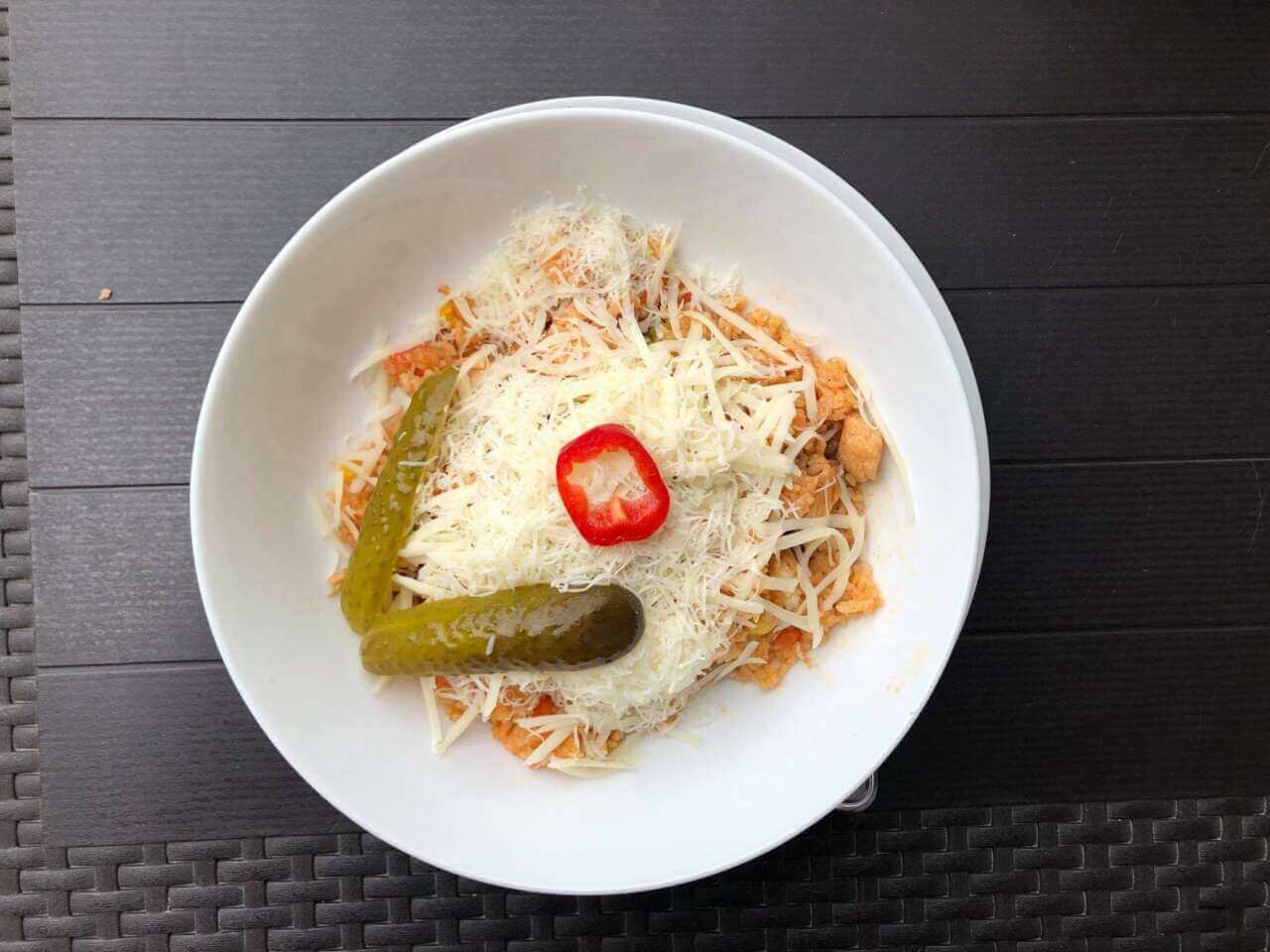 Rizoto s kuřecím masem a zeleninou, sypané sýrem, okurka, včetně polévky dle výběru … 119 Kč