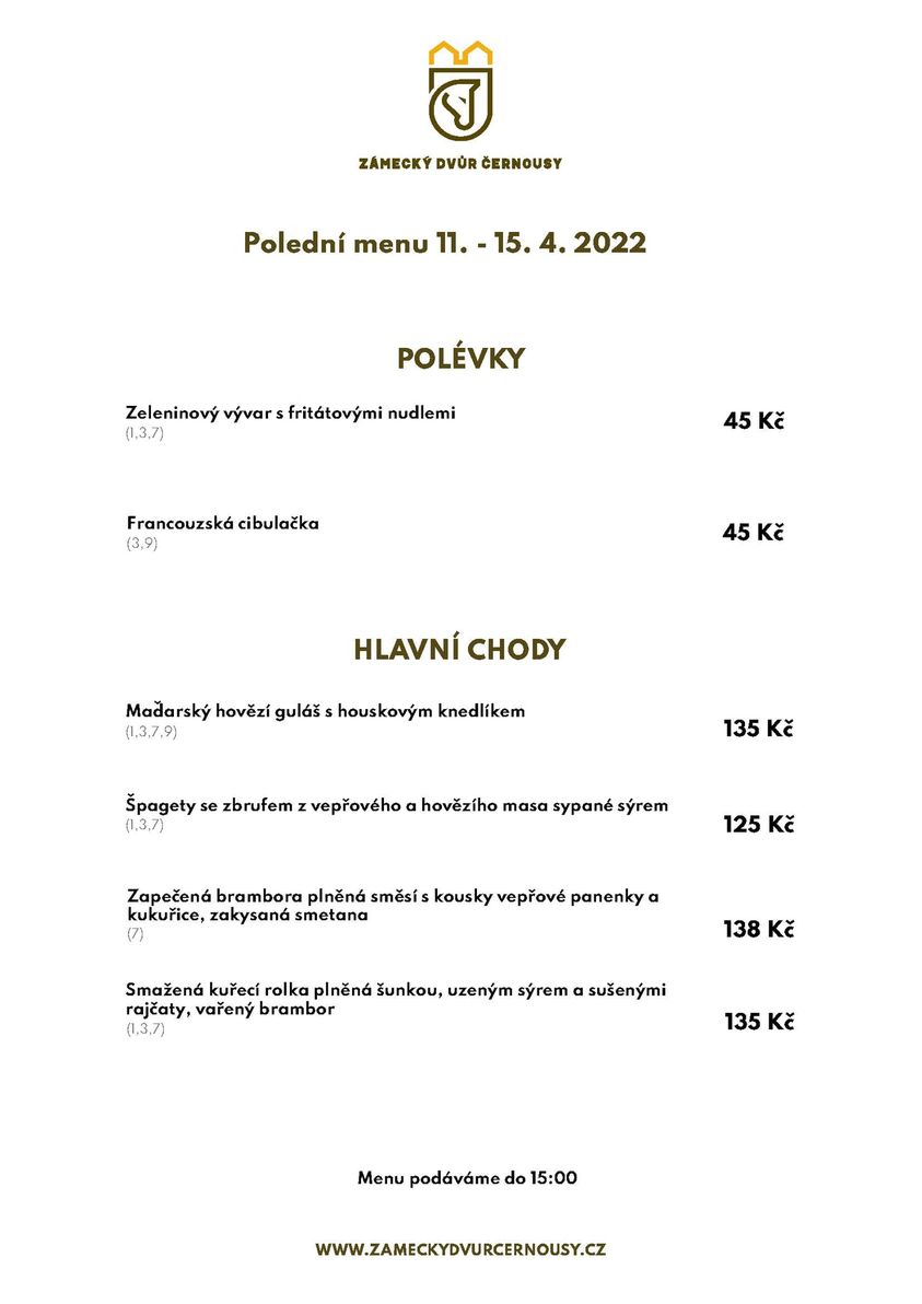 Polední obědové menu týden 11. – 15. dubna 2022 v Zámeckém dvoře Černousy
