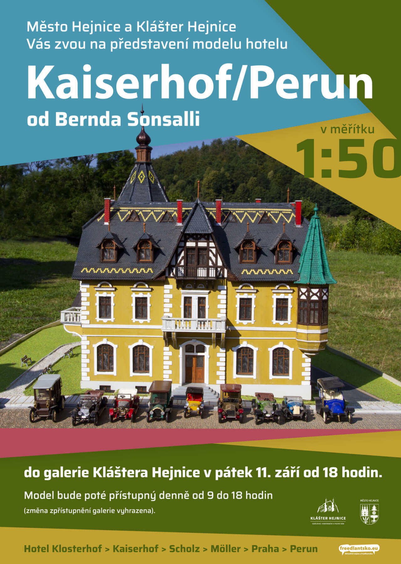 Město Hejnice a Klášter Hejnice Vás zvou na představení modelu hotelu Kaiserhof / Perun od Bernda Sonsalli v měřítku 1:50 do galerie Kláštera Hejnice v pátek 11. září od 18 hodin.