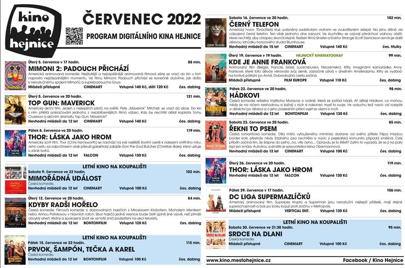 Představujeme Vám program kina Hejnice na měsíc červenec 2022. Připomínáme, že vstupenky na jednotlivá promítání