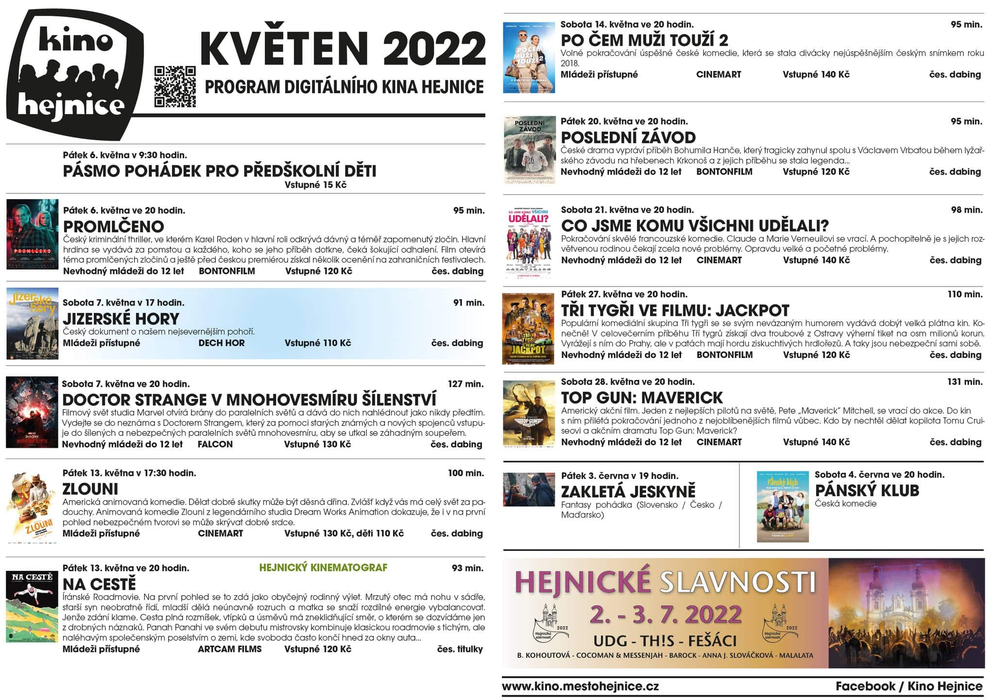 2022ne01květen0.00út31(květen 31)23.59Program Kina Hejnice na měsíc květen 2022Kino Hejnice, Jizerská 3, 46362 Hejnice, Liberecký kraj, Česko0.00 - 23.59 (31)(GMT+02:00) Druh akceHejnice,Kino Hejnice,Promítání,Veřejná akce