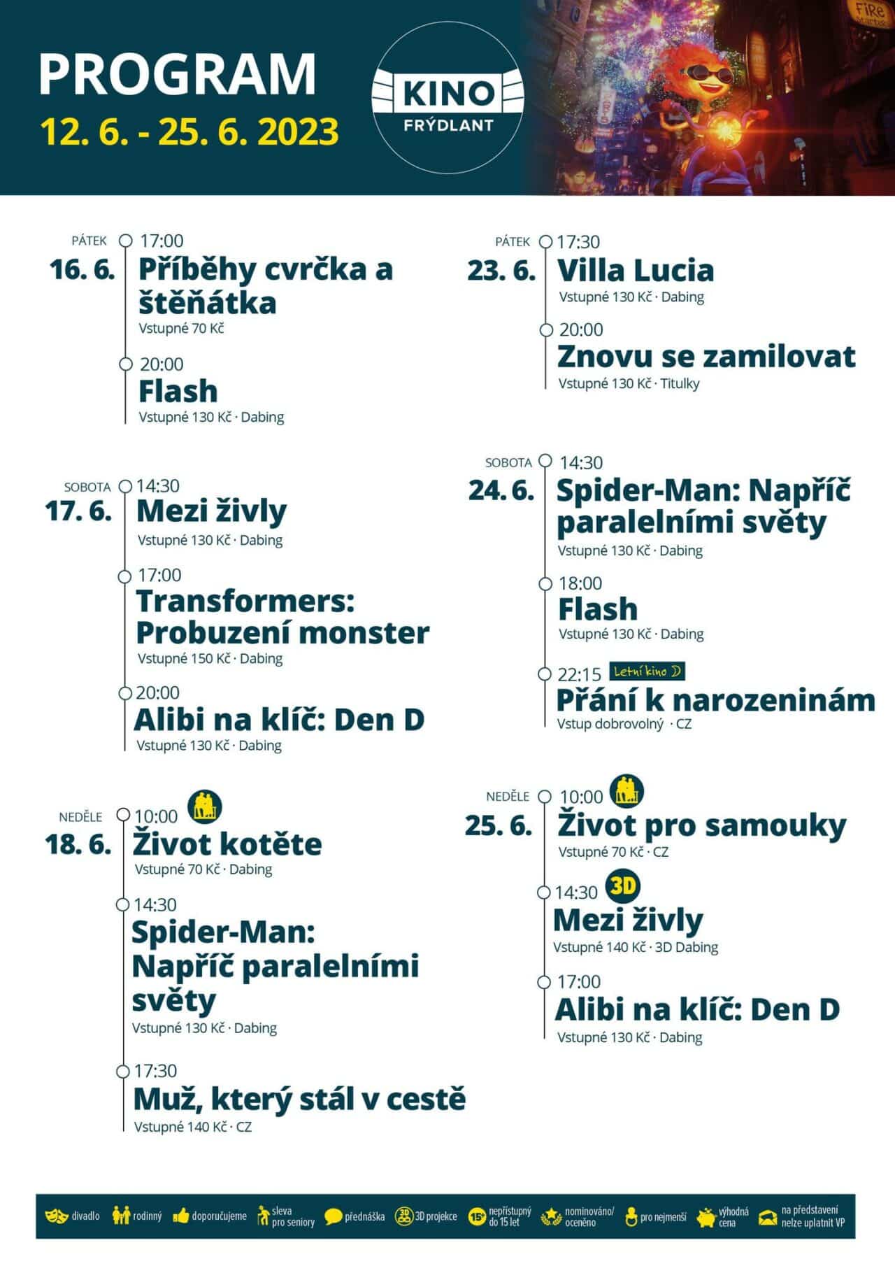 202316červen(červen 16)17.00ne25(červen 25)17.00Program Městského kina Frýdlant na druhou polovinu červnaMěstské kino Frýdlant, Tyršova 1077, 464 01 Frýdlant, Liberecký kraj17.00 - 17.00 (25)(GMT+02:00) Druh akceDivadlo,Kino Frýdlant,Promítání,Veřejná akce,Zábava