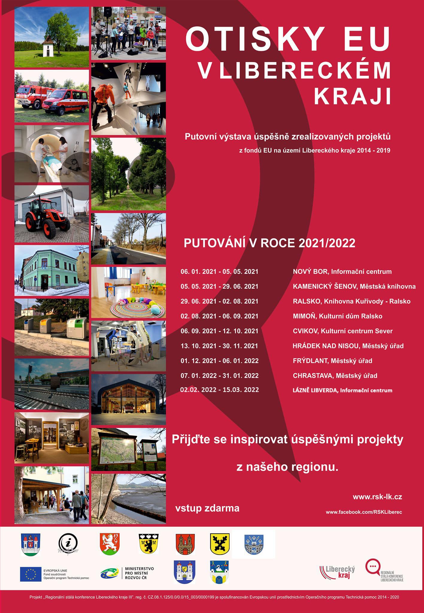 Zveme vás na putovní výstavu Otisky EU v Libereckém kraji, kterou připravil Sekretariát Regionální stálé konference Libereckého kraje. Výstava úspěšných projektů, které podpořily fondy EU v období 2014 – 2019, má za cíl představit, co potřebného a zajímavého se v našem regionu uskutečnilo. Ambicí je také inspirovat další potenciální realizátory projektů ke skvělým nápadům, které náš kraj budou dále rozvíjet.