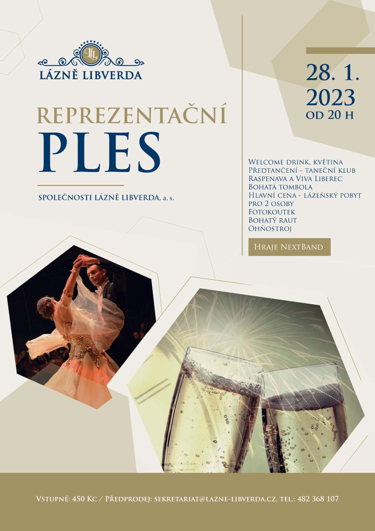 Zveme Vás na REPREZENTAČNÍ PLES ve Spa Resortu Libverda v sobotu 28. ledna. 2023 konaný v Clam-Gallasově Paláci. PROGRAM: 19:30 – 20:00 uvítání a uvedení hostů ke stolu,